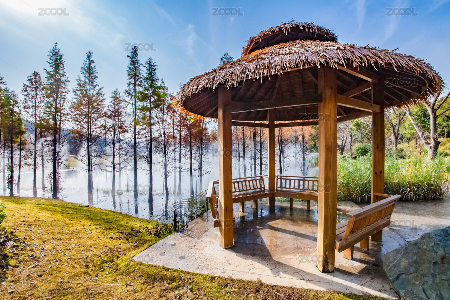 杭州余杭良渚古城遗址公园中式木结构长廊