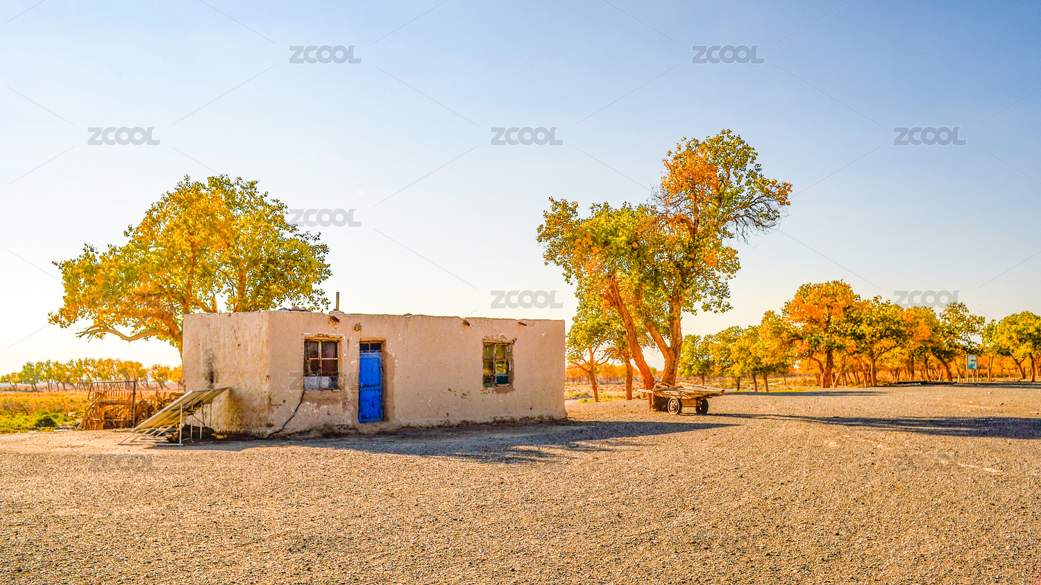 中国新疆博尔塔拉州艾比湖湿地秋季胡杨林中的村庄