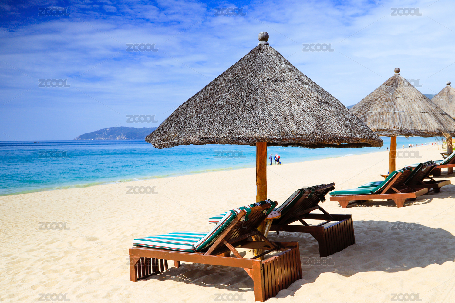 晴天海南三亚牙龙湾风景区海滩上休闲躺椅