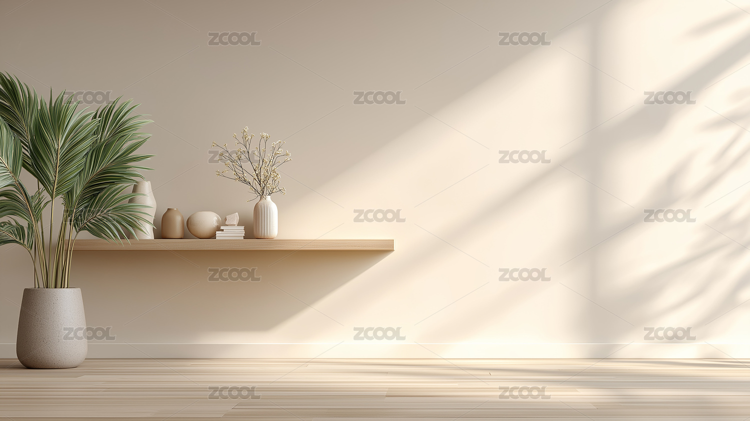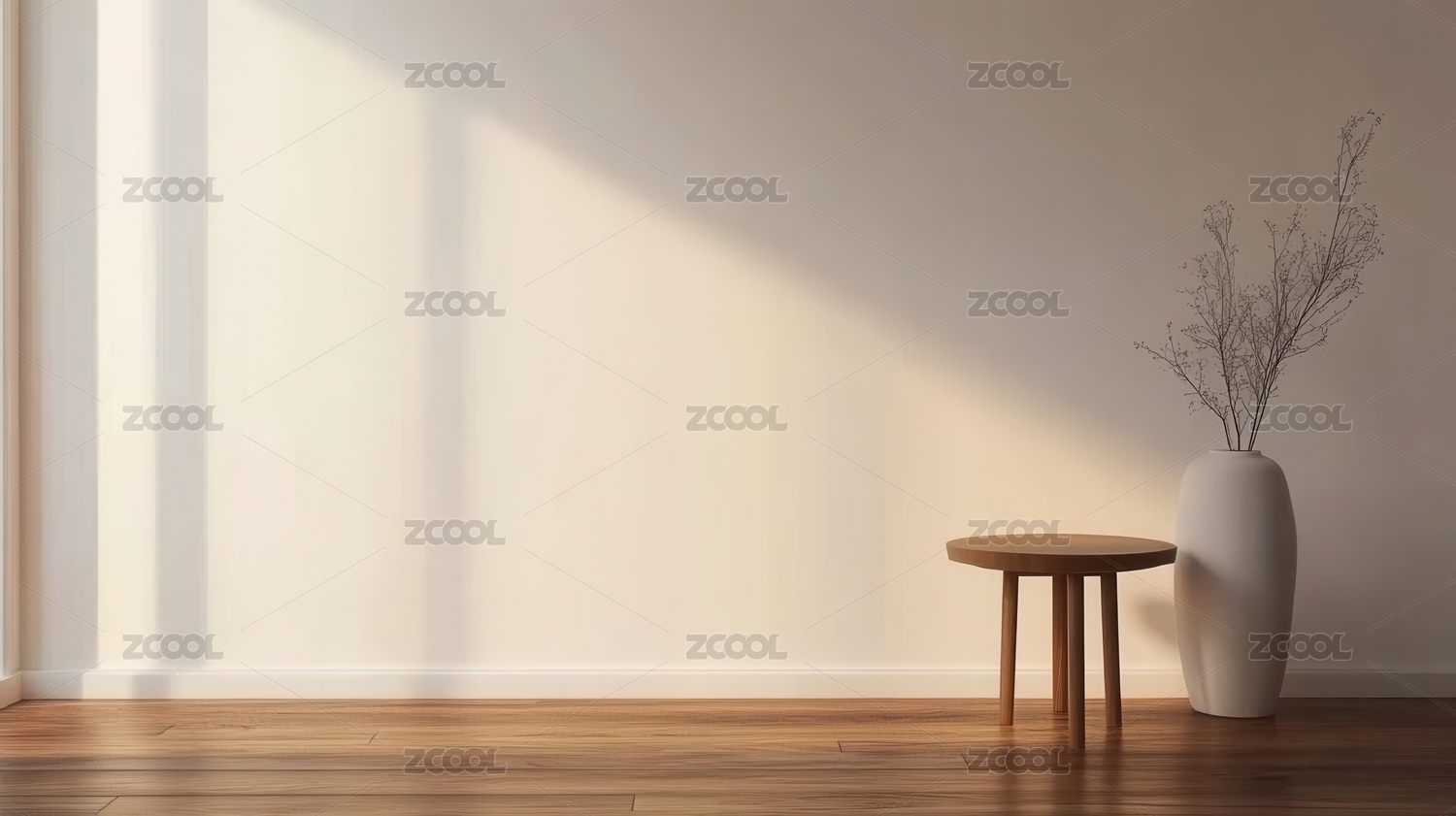 简约风格,室内场景,柜子,白色花瓶,装饰,白色墙面,地板,简洁风格,柔和光线,明亮