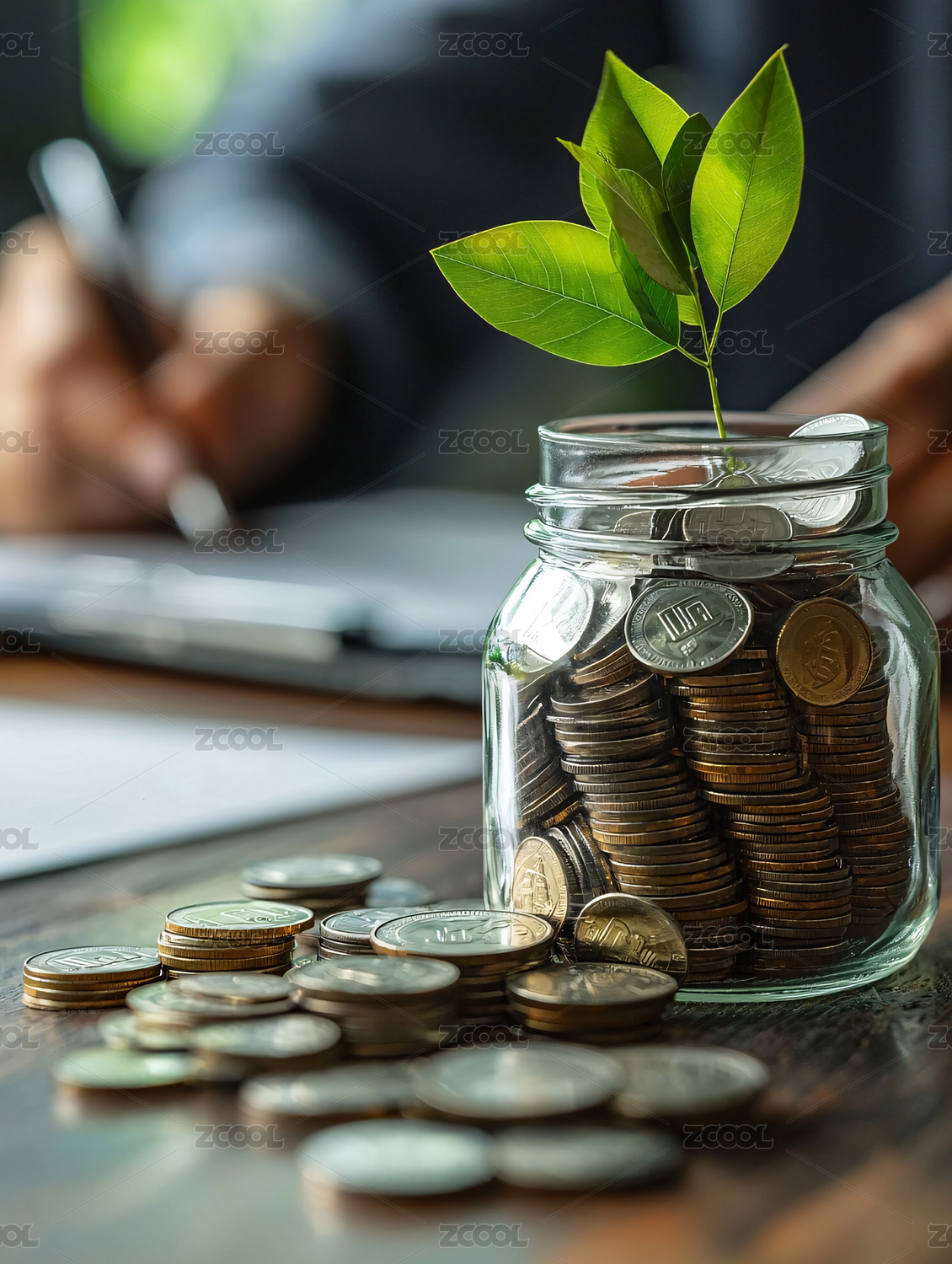 盛满欧元硬币的玻璃瓶里长出一颗幼苗