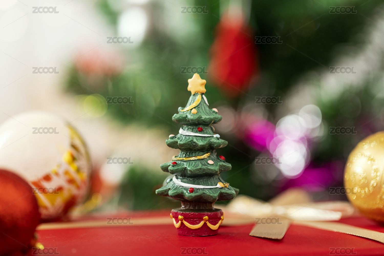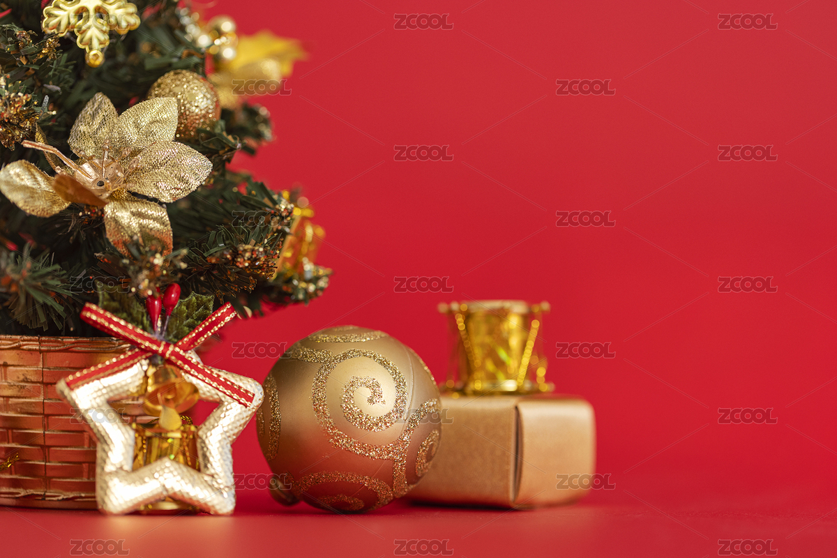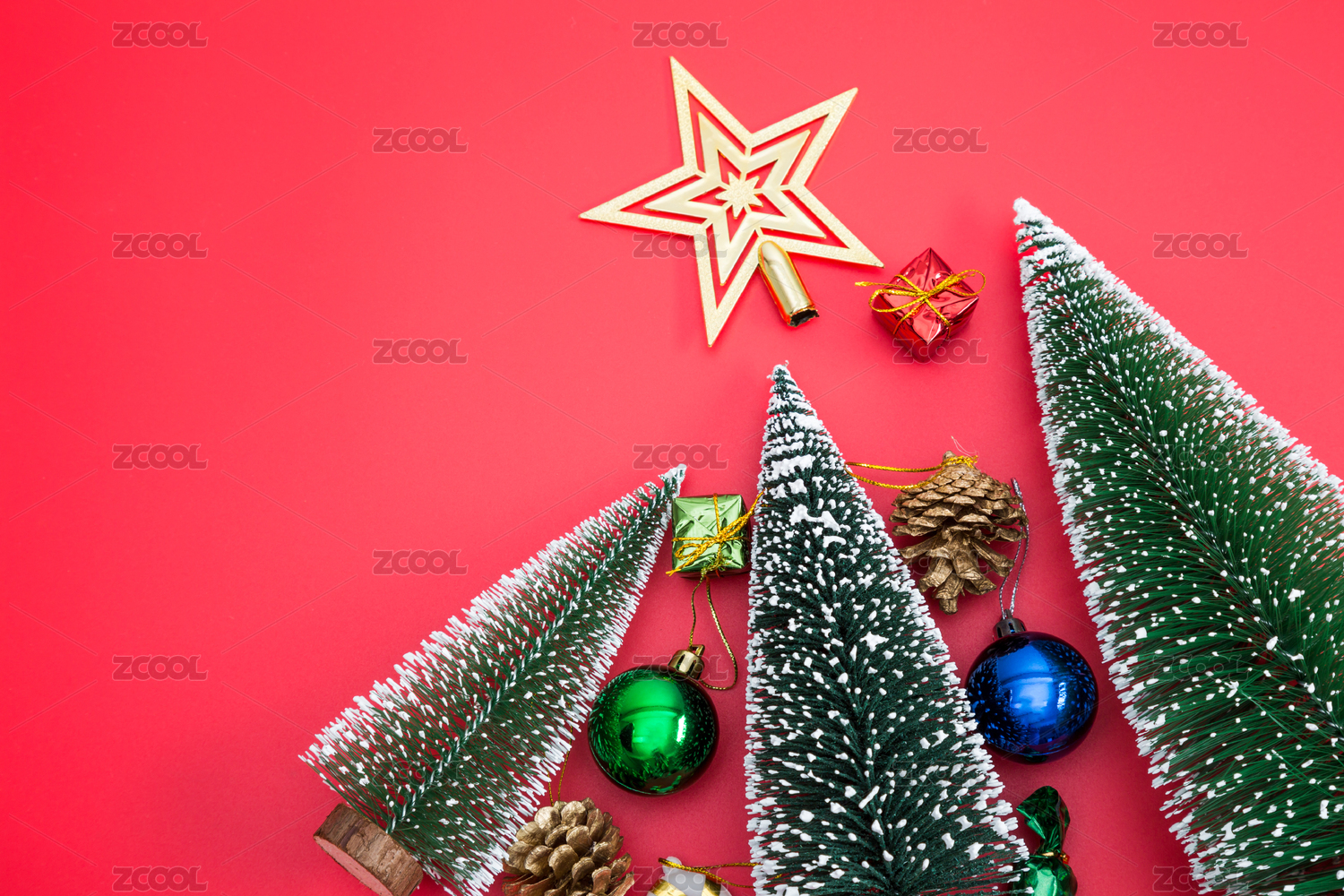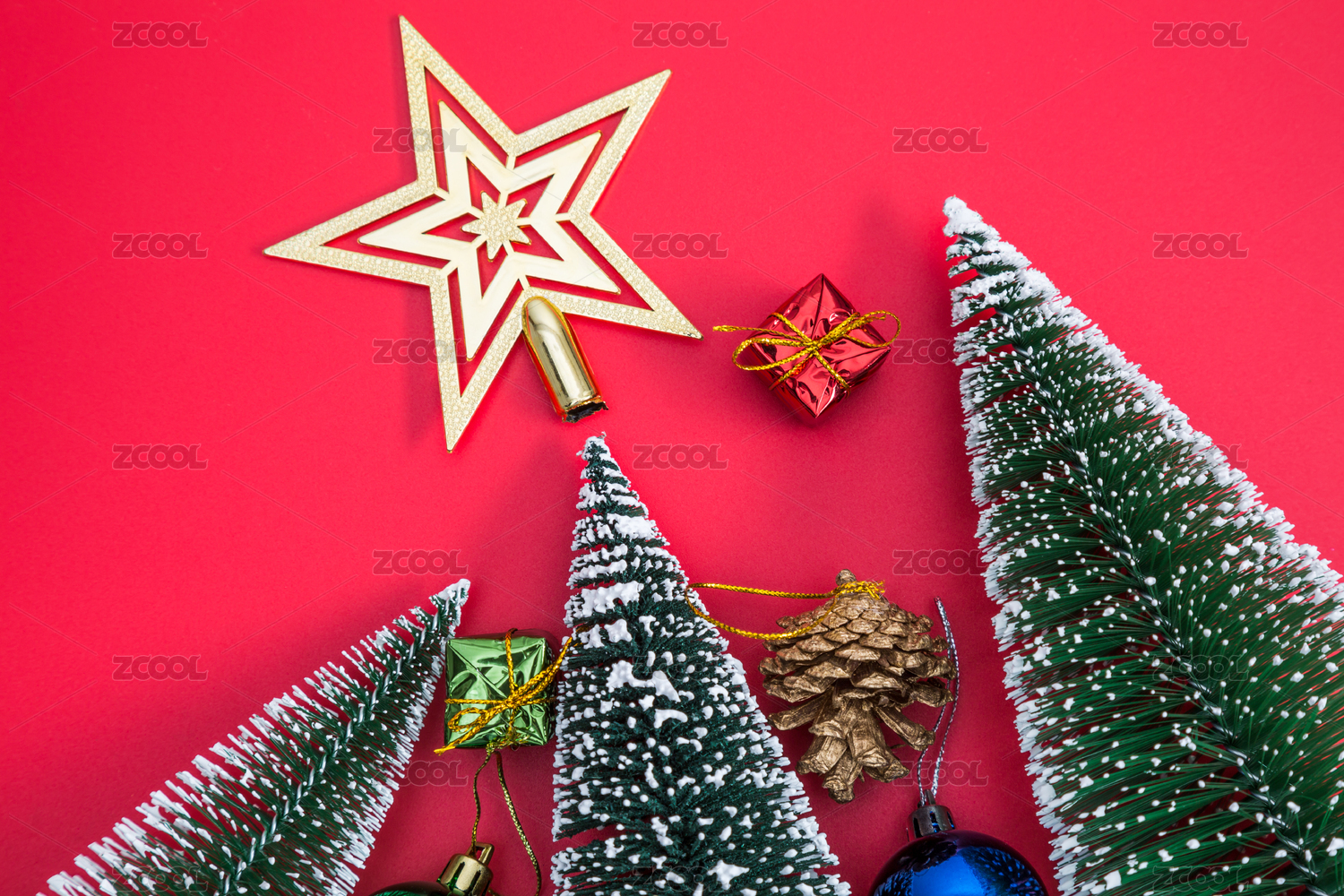 圣诞节装饰品,圣诞彩灯,圣诞树,圣诞球以及星星等在红色背景上