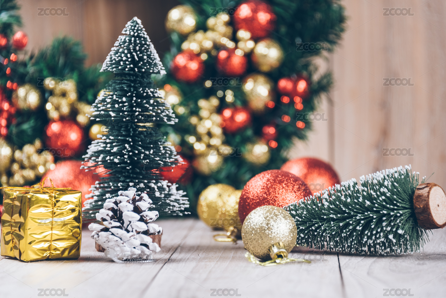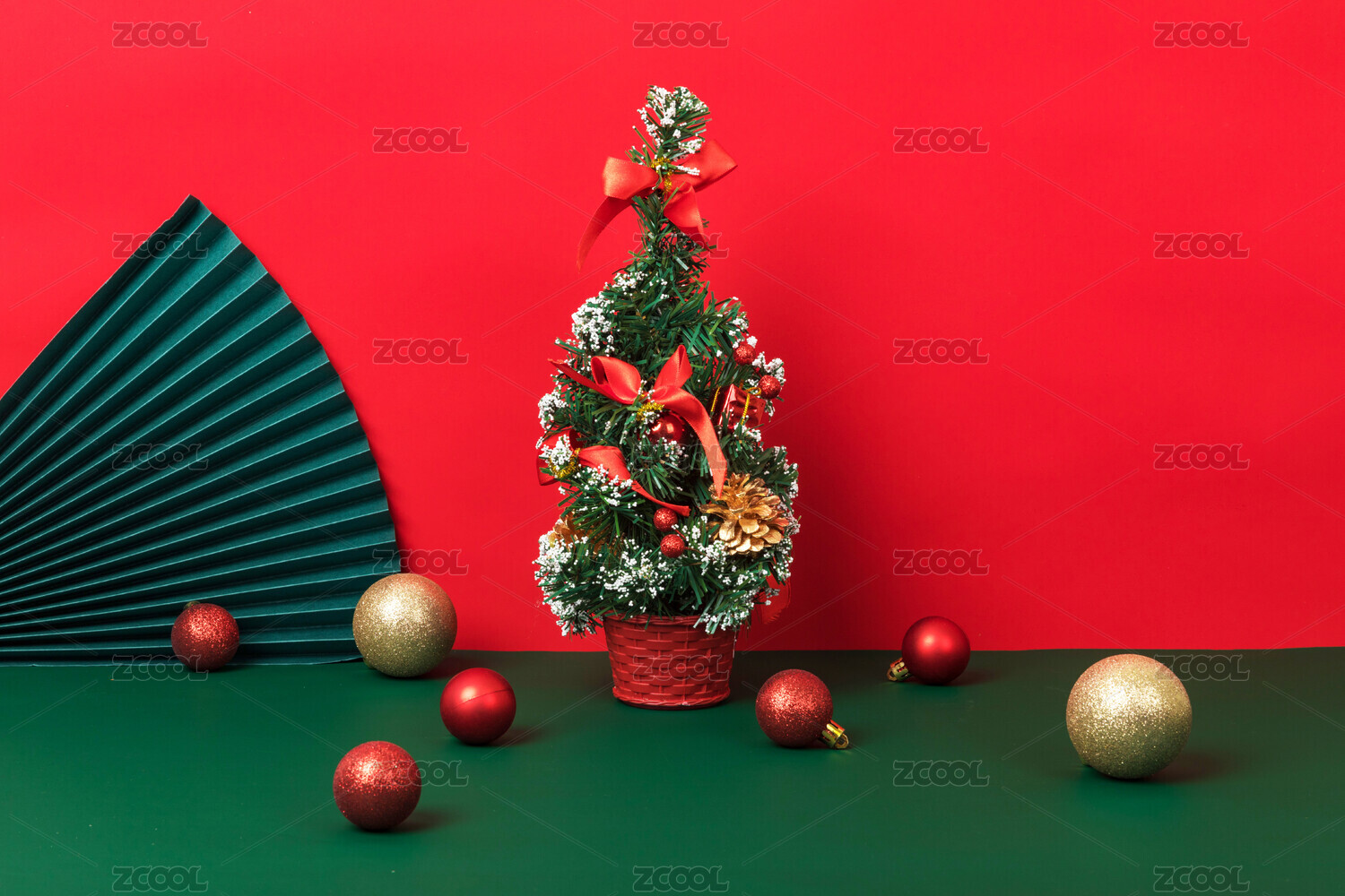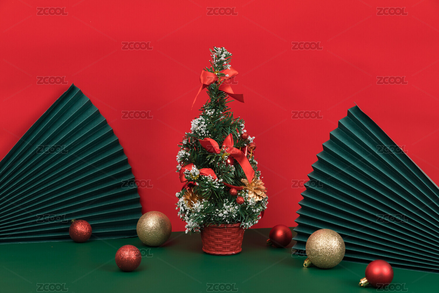 圣诞节装饰品,圣诞彩灯,圣诞树,圣诞球以及星星等在红色背景上