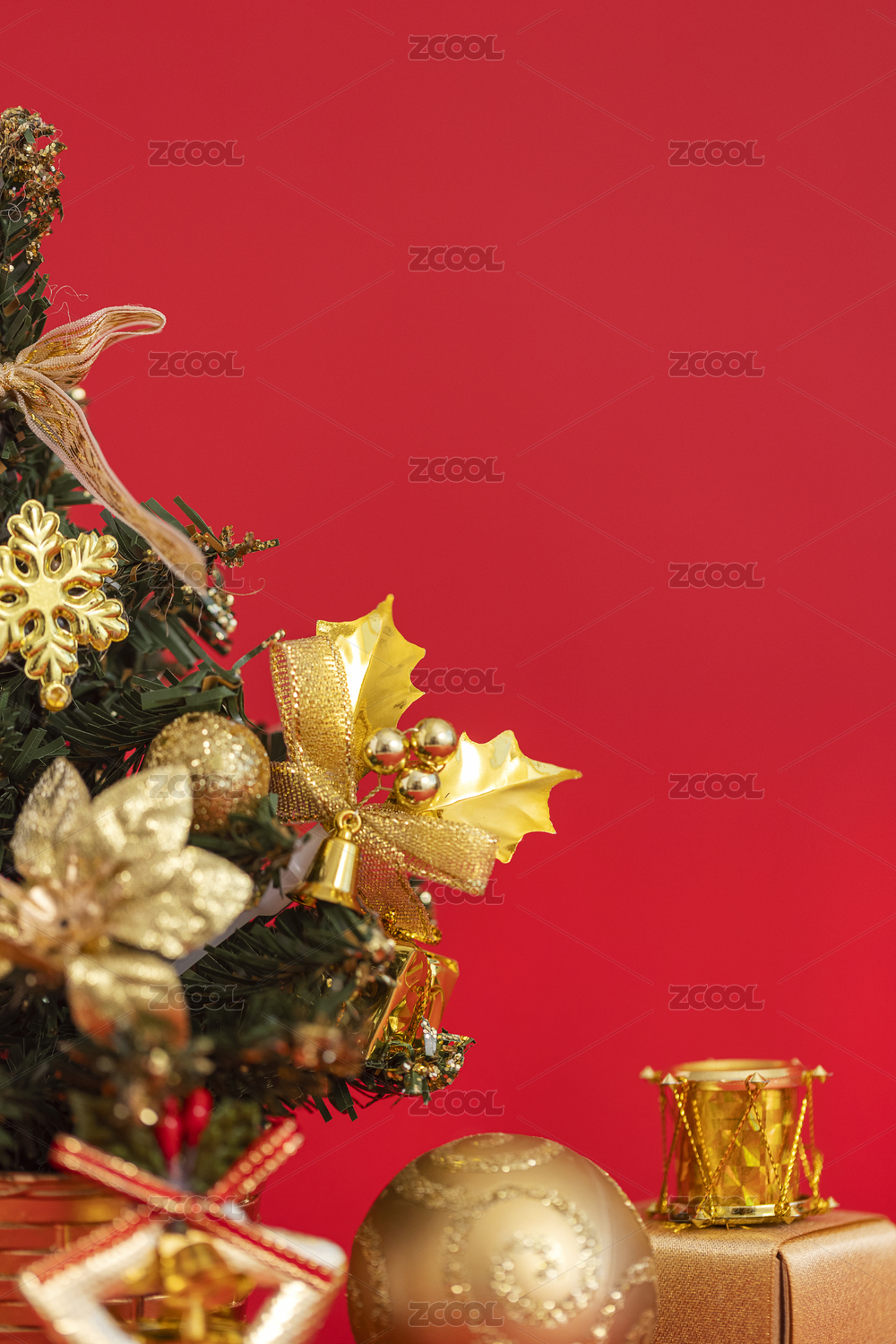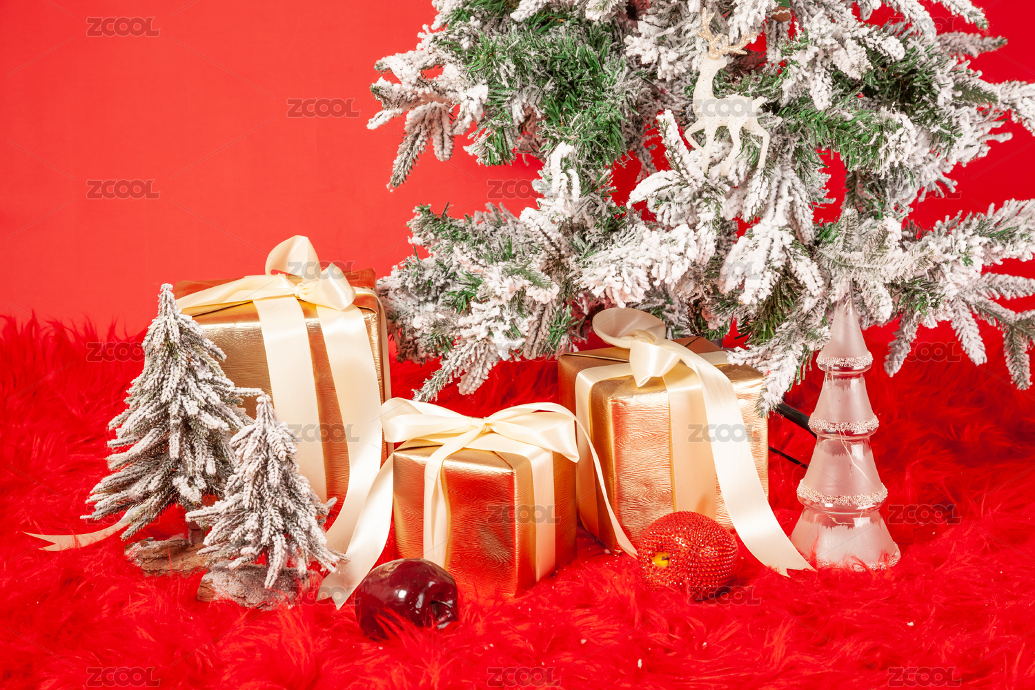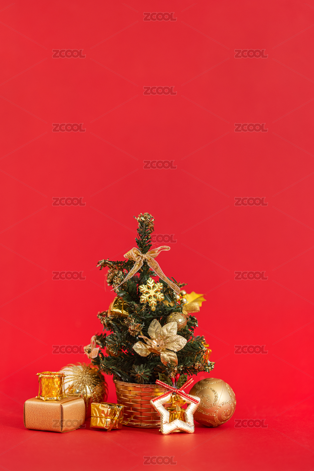 圣诞节背景,圣诞树和礼物,以及圣诞节装饰品在红色背景