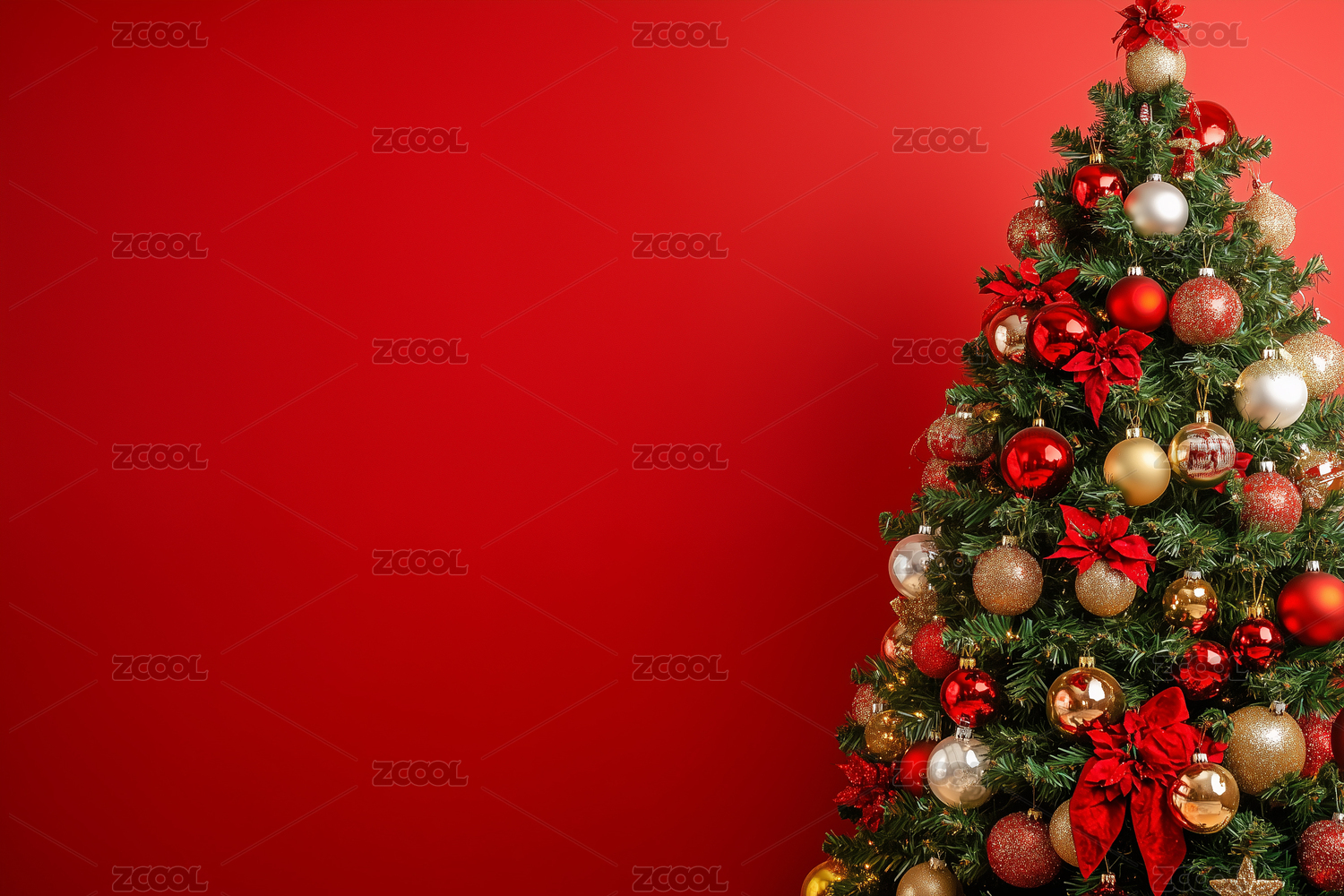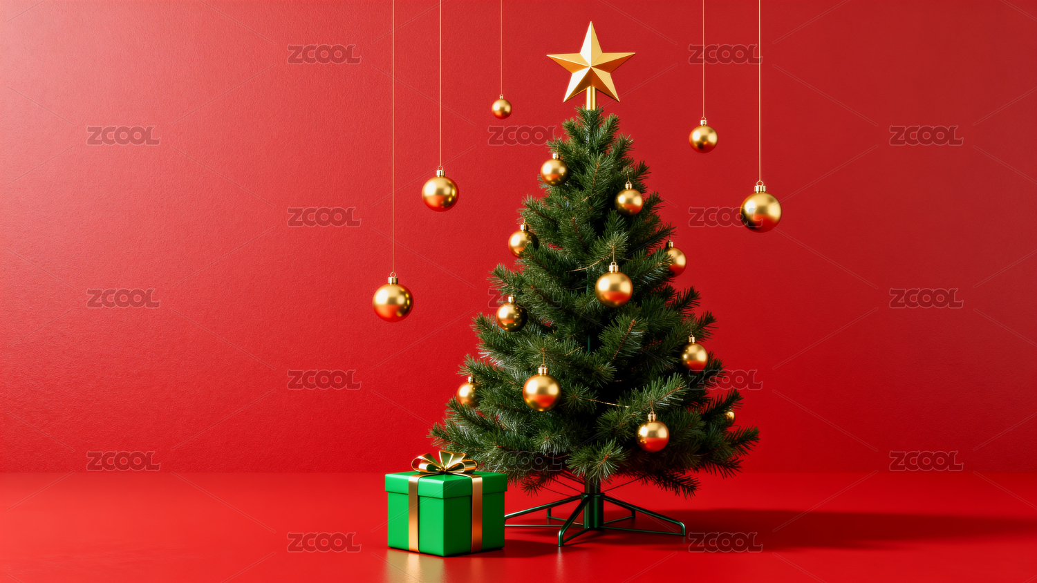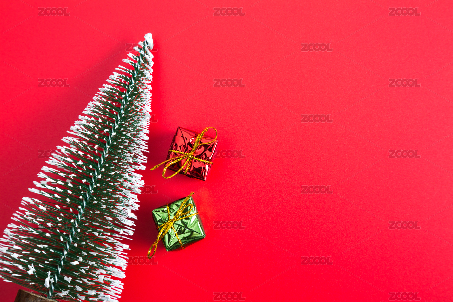 圣诞节背景,圣诞树和礼物,以及圣诞节装饰品在红色背景