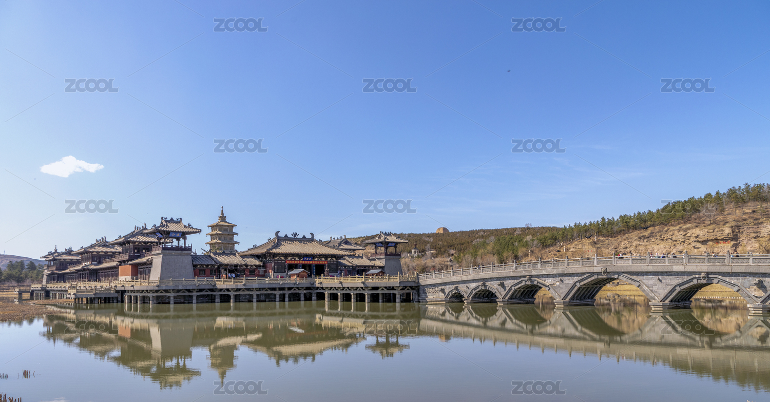 中国山西大同云冈石窟灵岩寺古建筑水中倒影风光