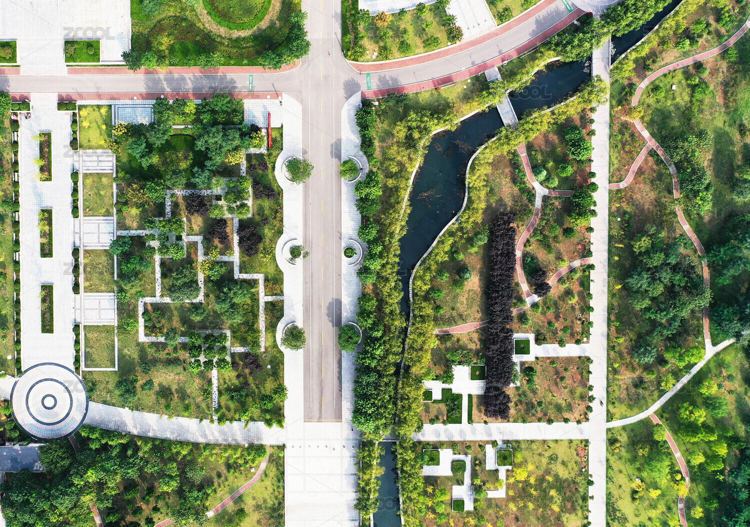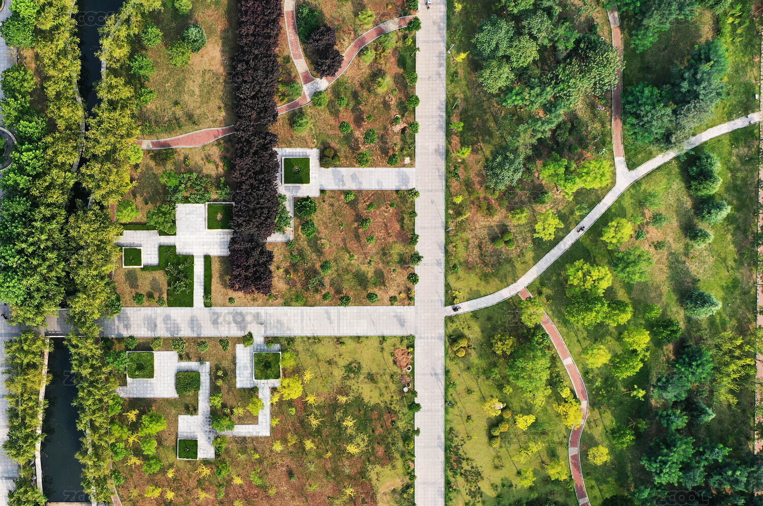 空中拍摄俯视秋天公园步道与花园组成的漂亮几何图形