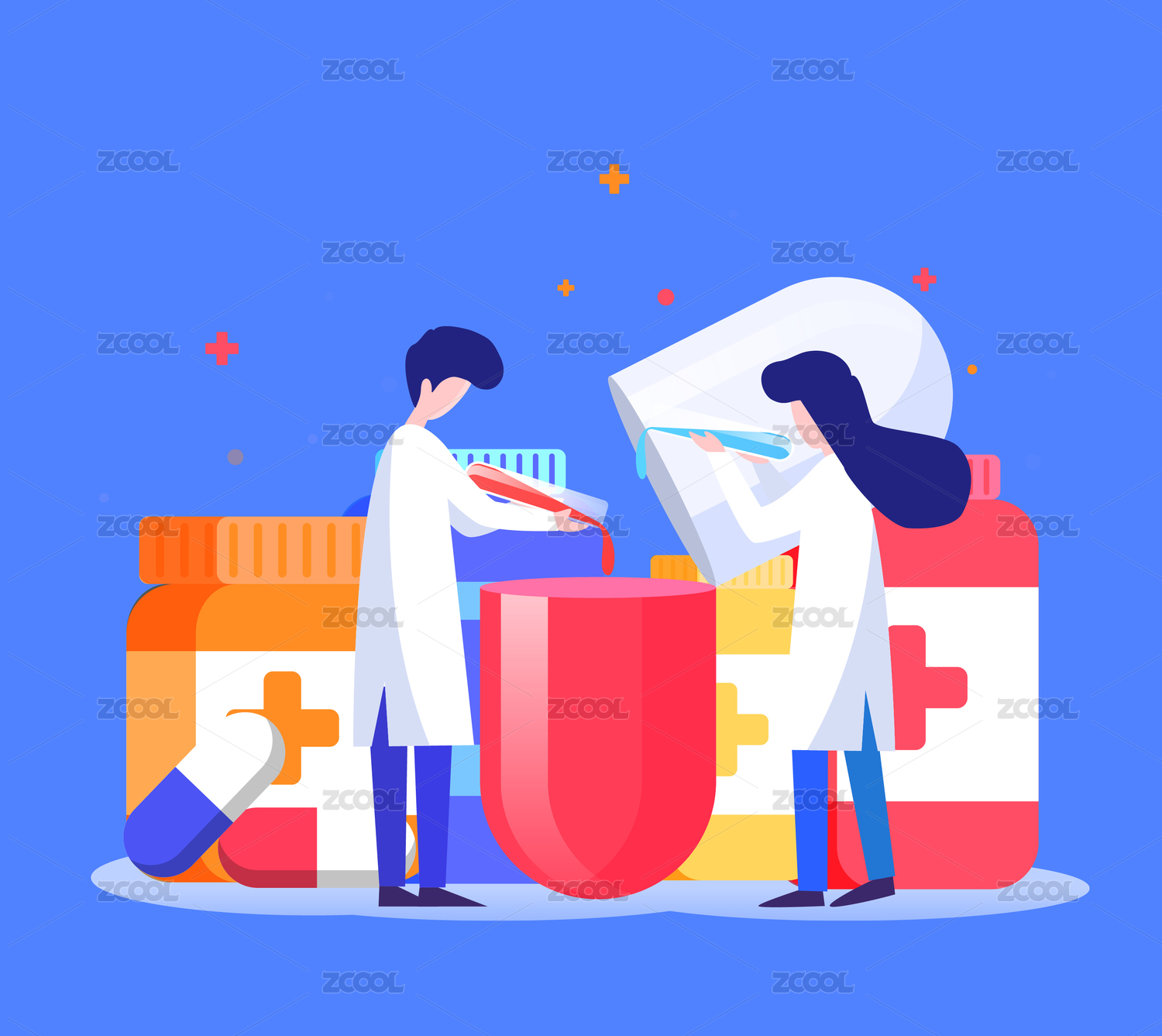 医疗健康科研团队药丸药瓶保险插画矢量图