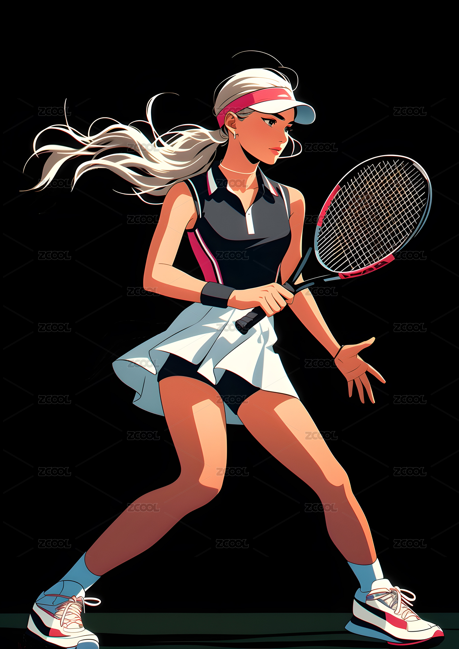 女运动员打网球色彩平面插图