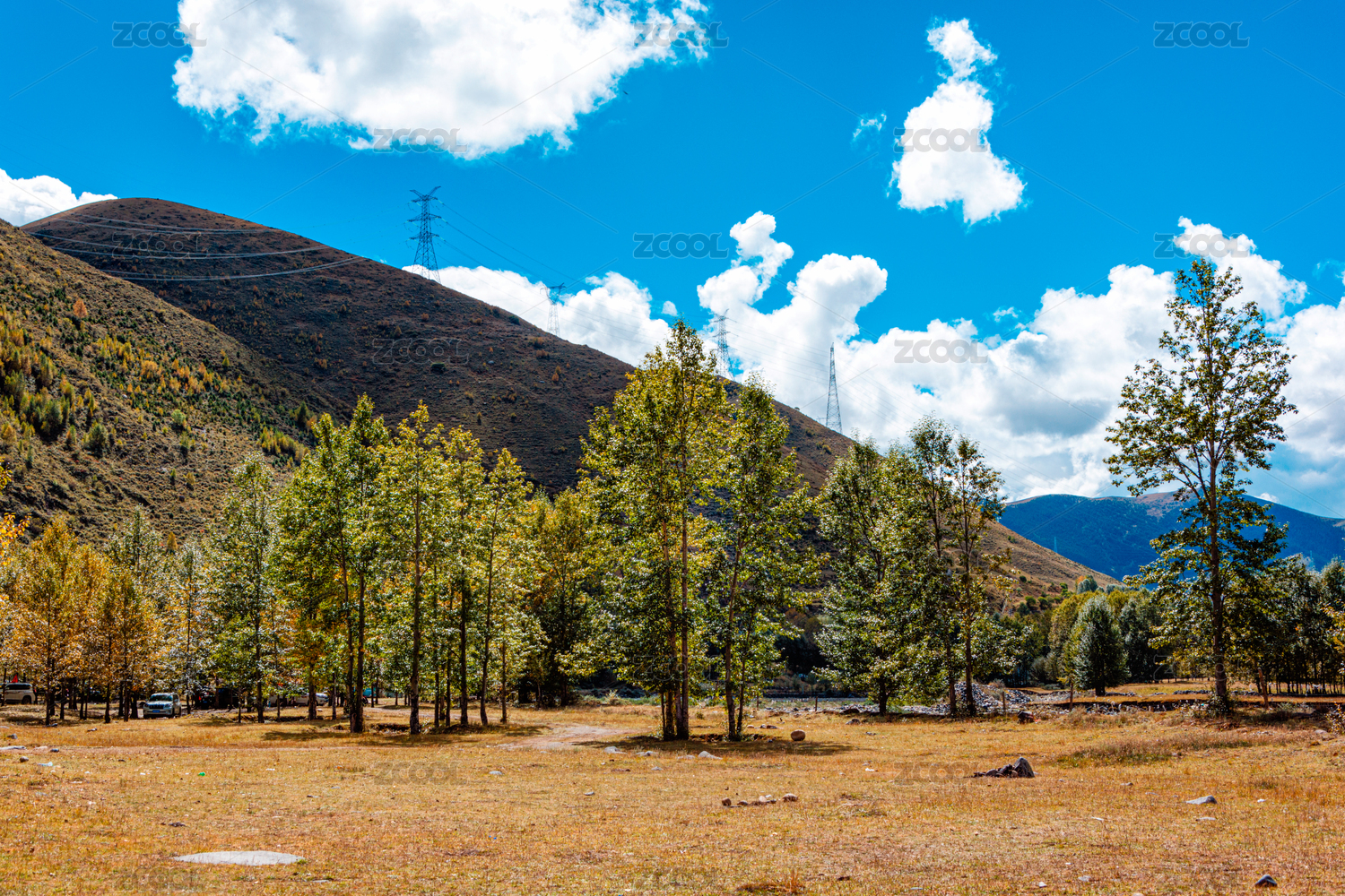 中国四川新都桥秋季金黄色树林河流山脉自然风光