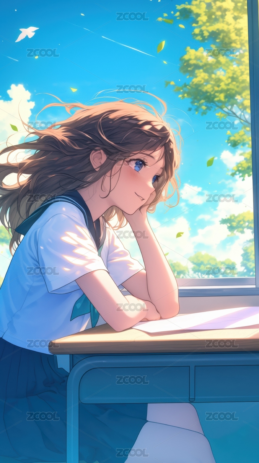 日漫,学校,教室,学生,女孩,少女,窗户,大树,人,人物