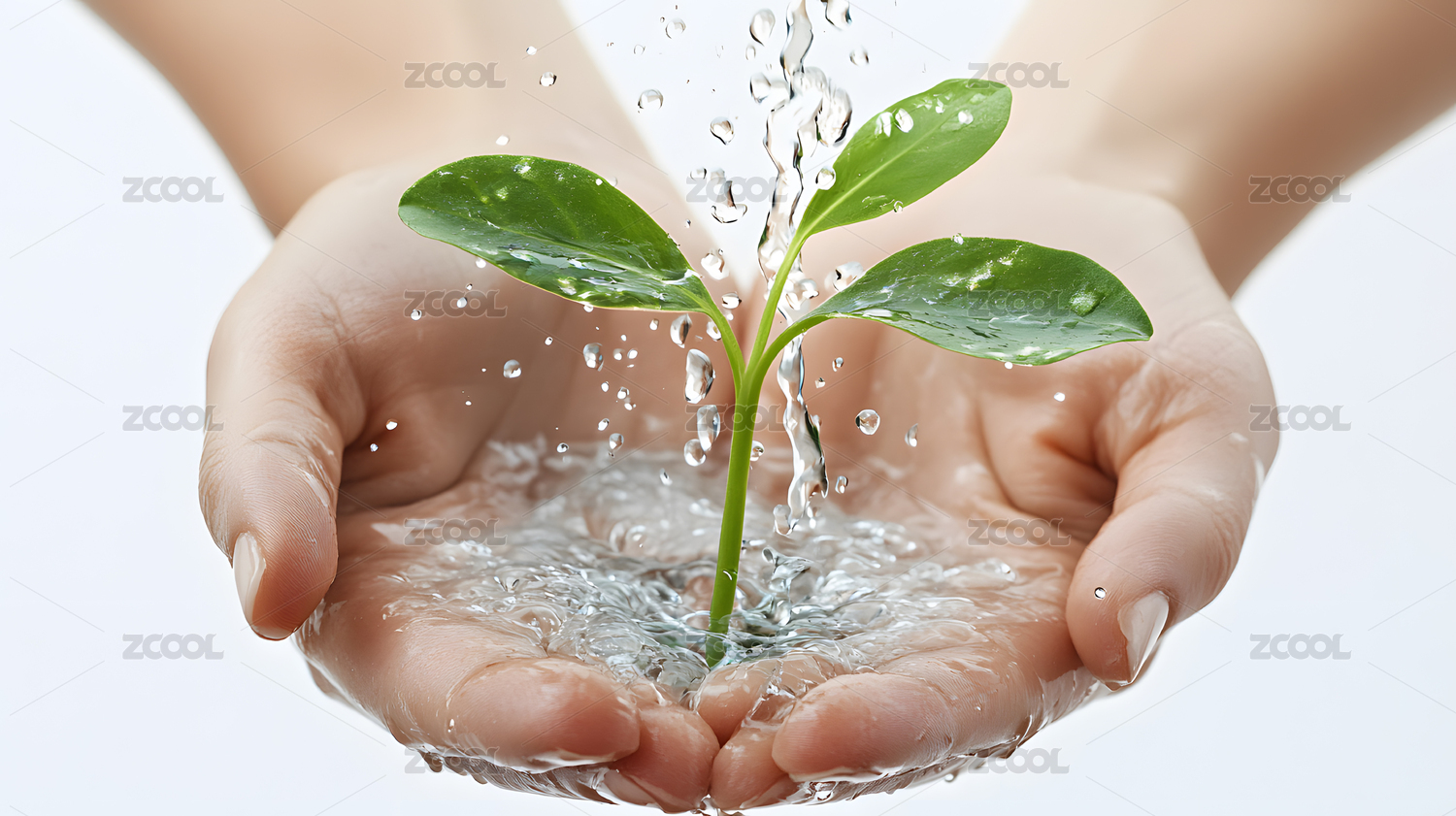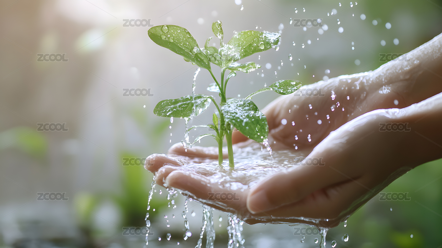 手中水滴浇灌的绿色植物环保创意图