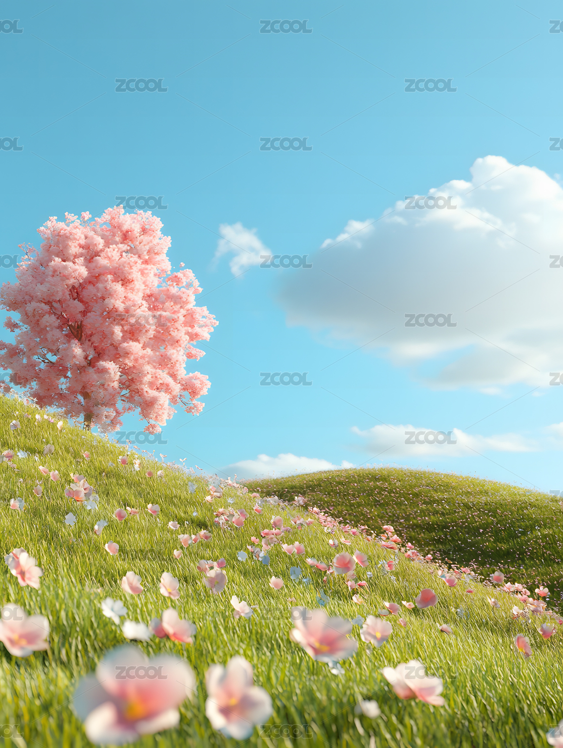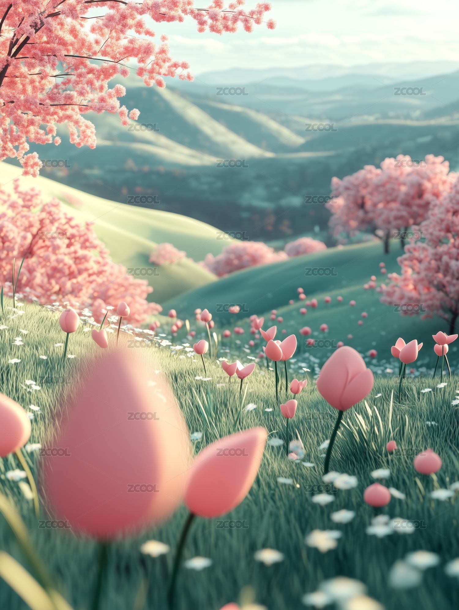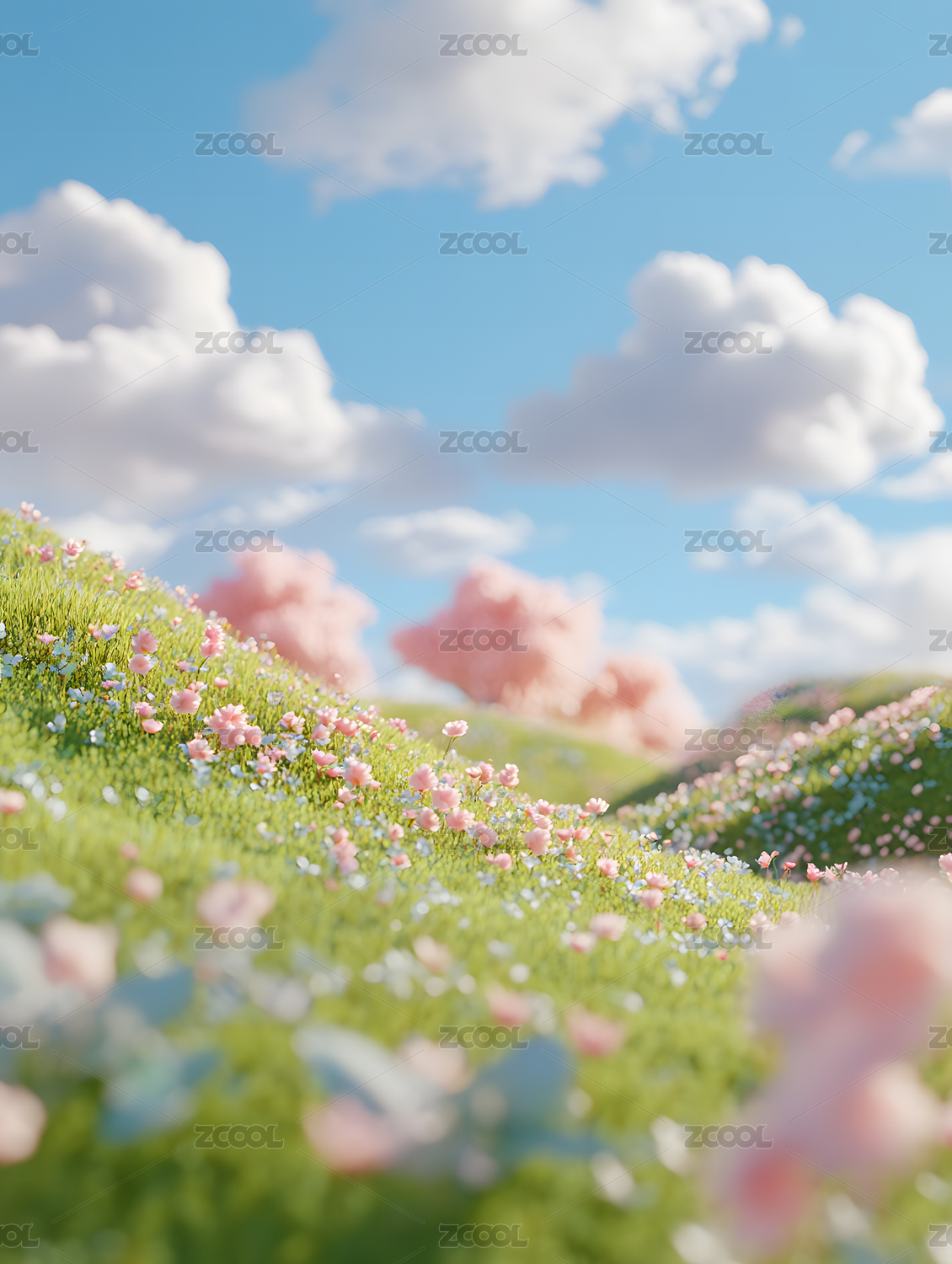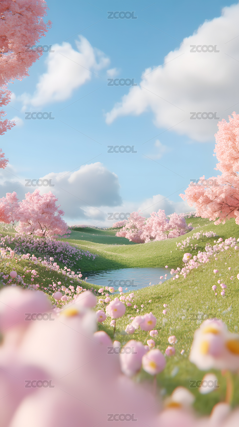 3D卡通春天草地可爱粉色花朵三维自然背景