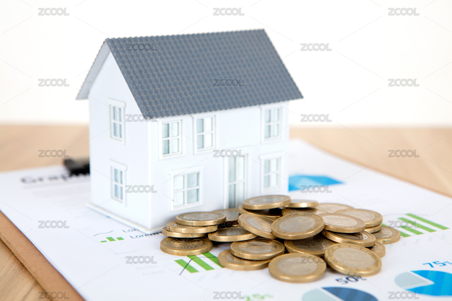 俯视桌子上的文件资料和递增的美元硬币及小房子模型