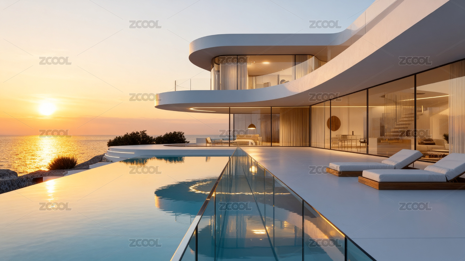 夕阳下的别墅海边现代建筑内部景观无边泳池