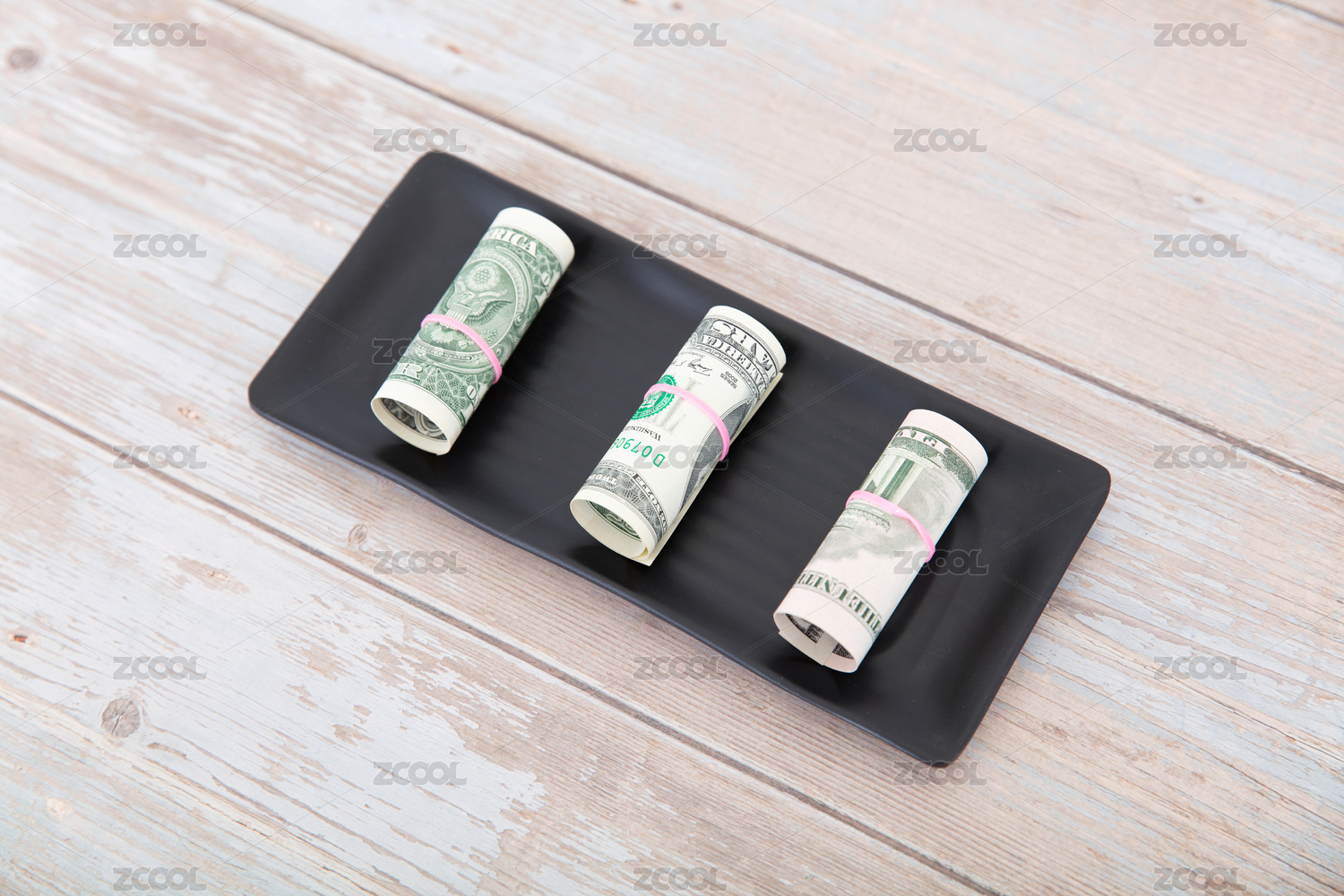 餐桌上的盘子里一排整齐卷筒状的美元钞票