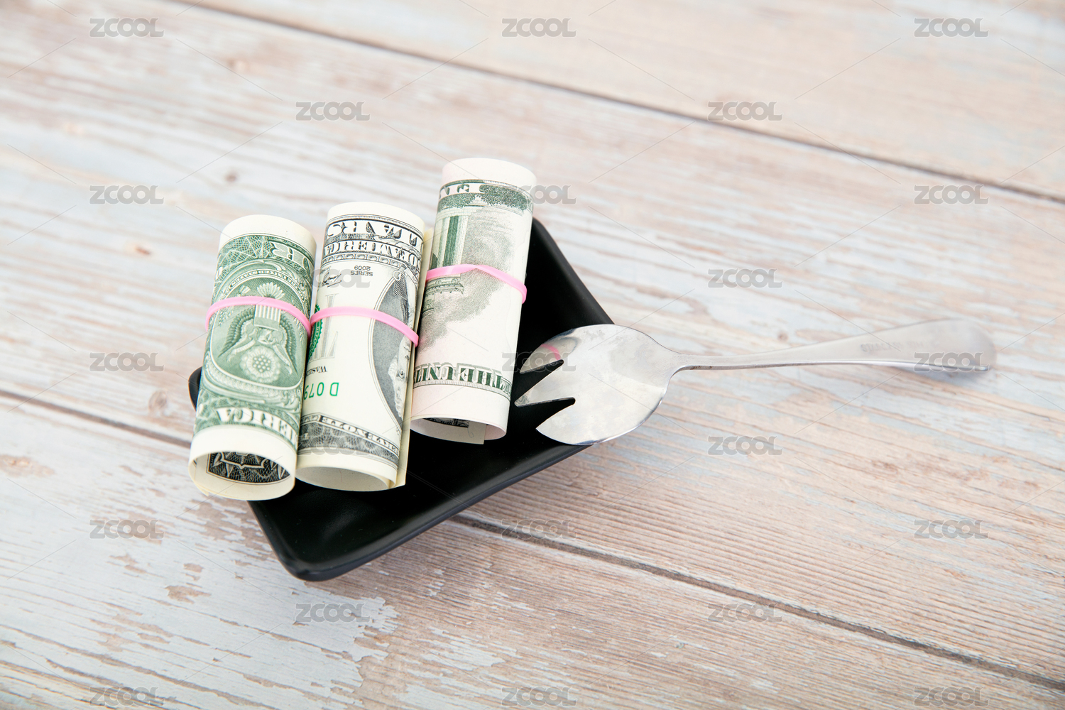 俯视餐碟里盛放着的美元钞票和一把餐勺