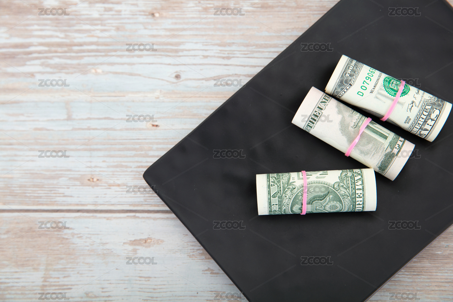 桌子上一个黑色的盘子和盘子里盛着的美元钞票