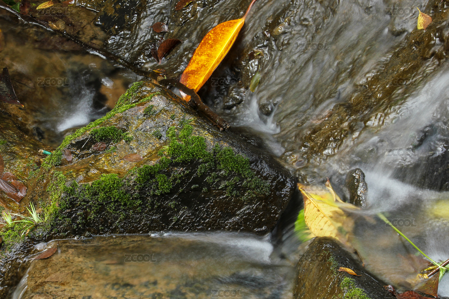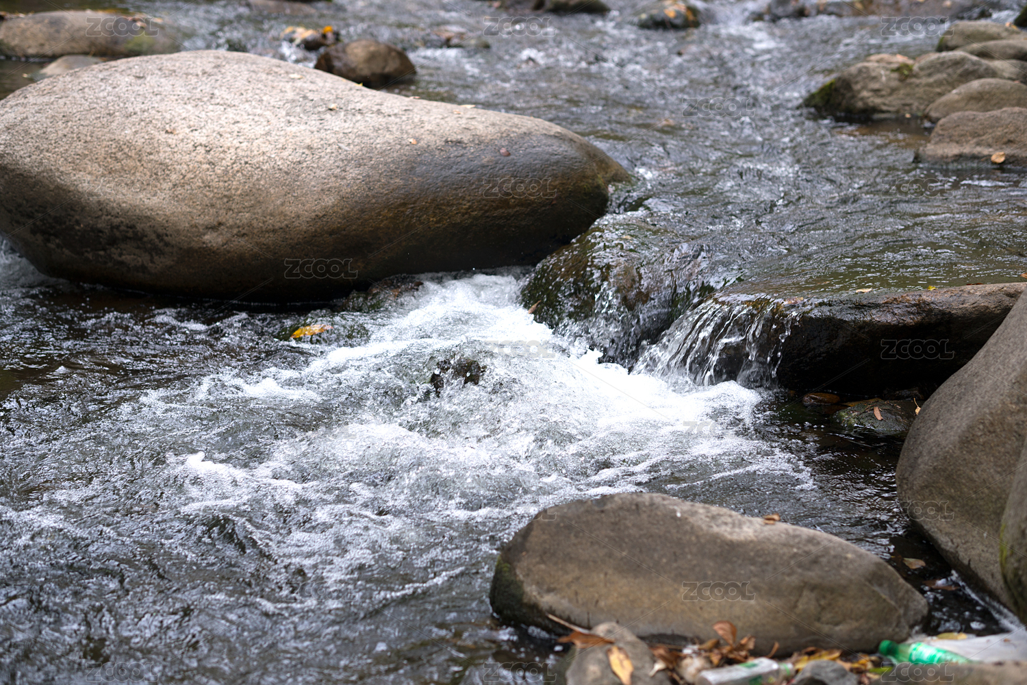 清澈的小溪从岩石上流过的画面