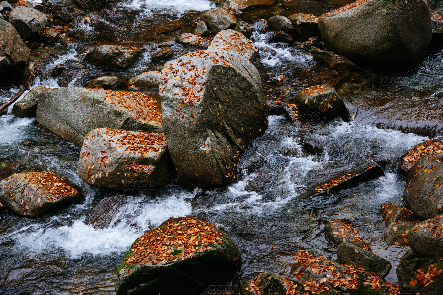 山涧美丽的红叶和落叶自然风光