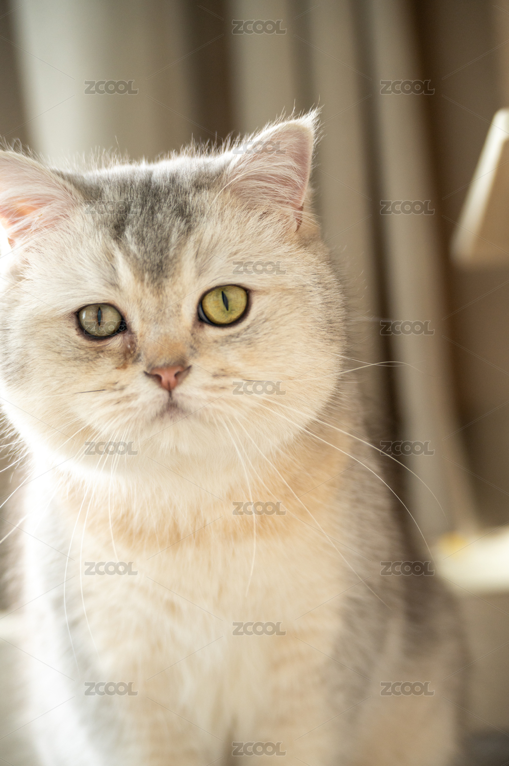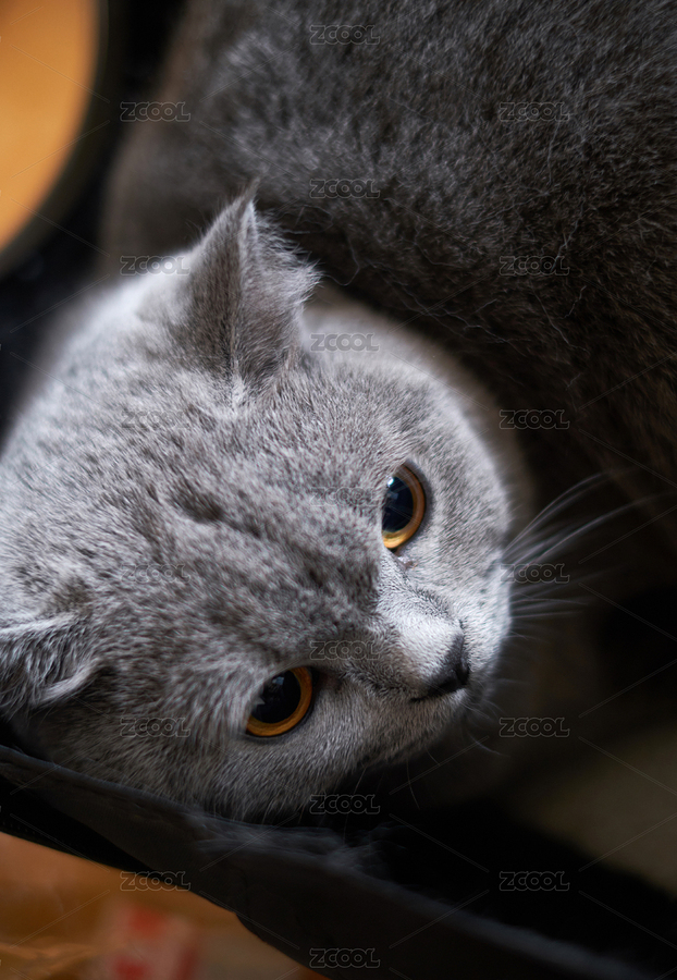 有些肥胖英国短毛猫舔完毛后看着周围的环境