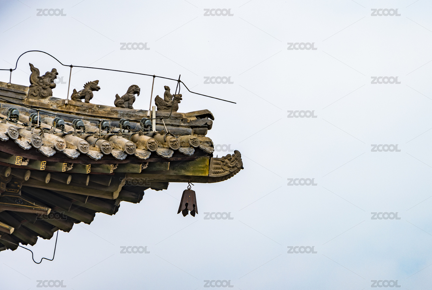 蓝天下的北京中山公园宰牲亭屋顶房檐特写