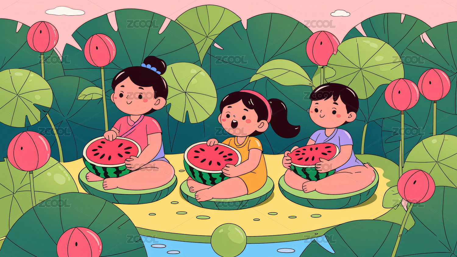 夏天男孩女孩池塘里吃西瓜玩耍插画