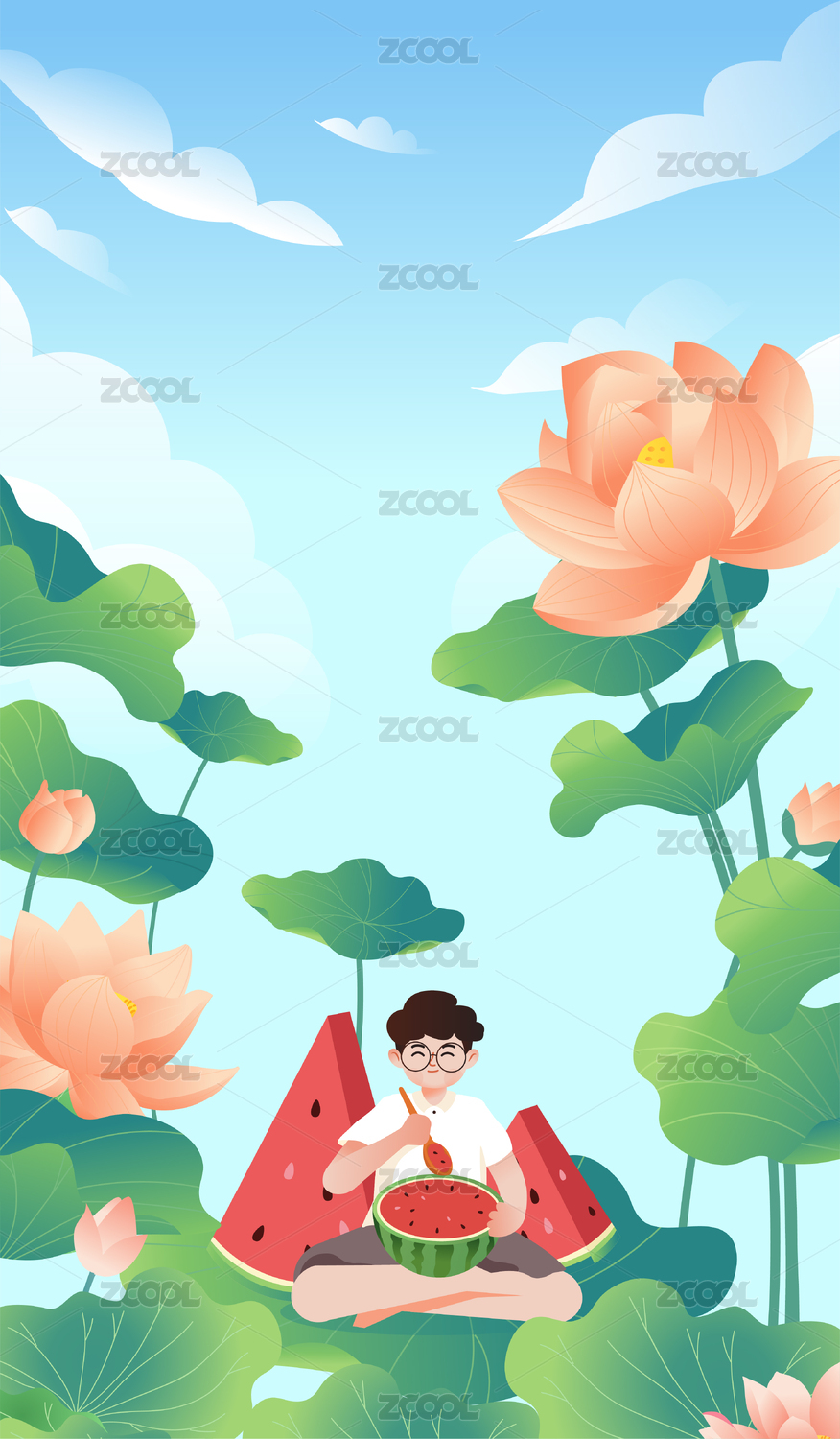 立夏节气人物解暑降温插画夏天西瓜荷花海报