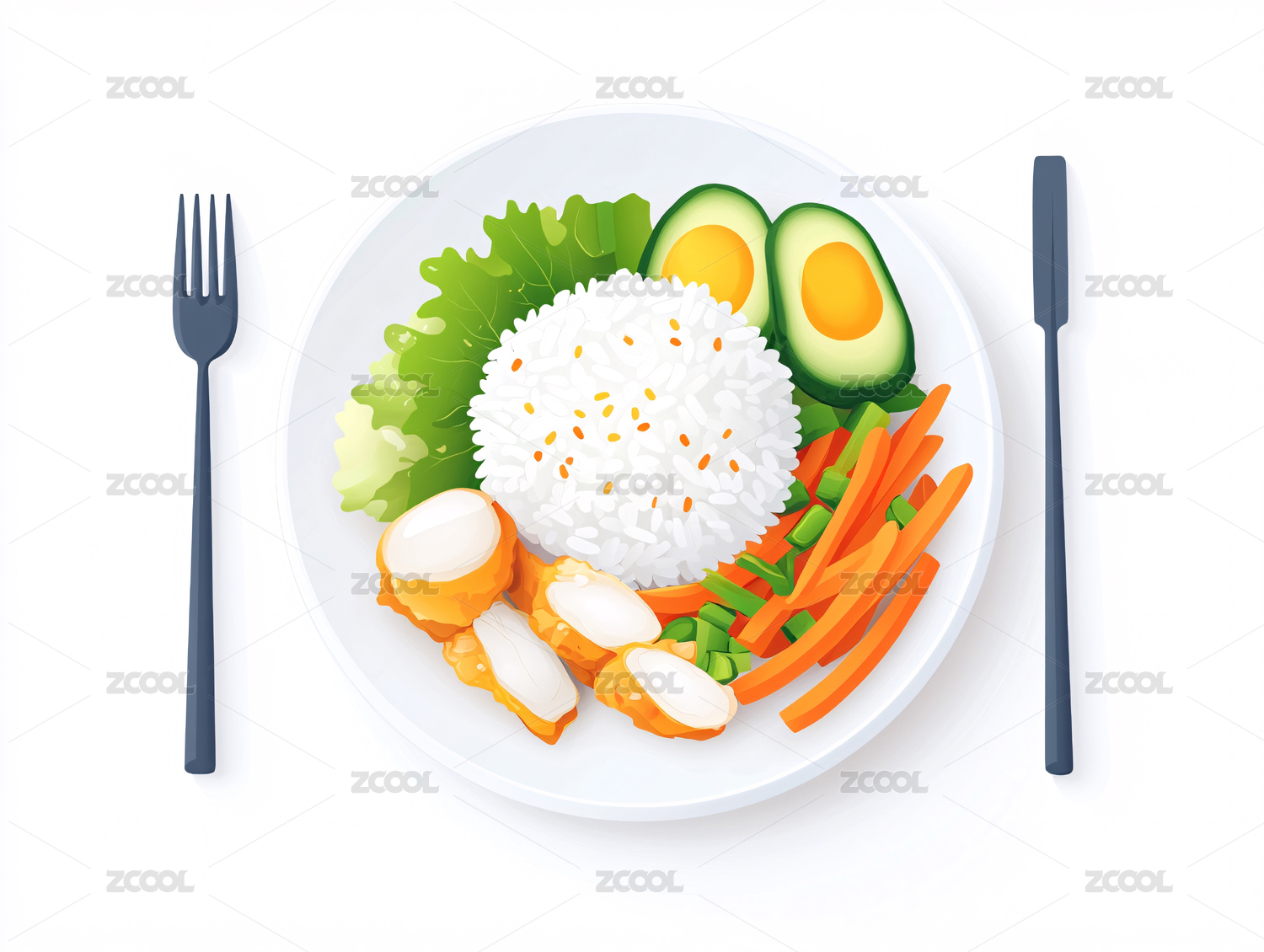 扁平风健康食品轻食大虾鸡蛋沙拉美食插画