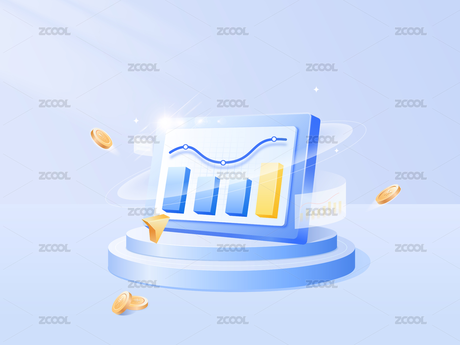 蓝色背景下的数据图表与金币