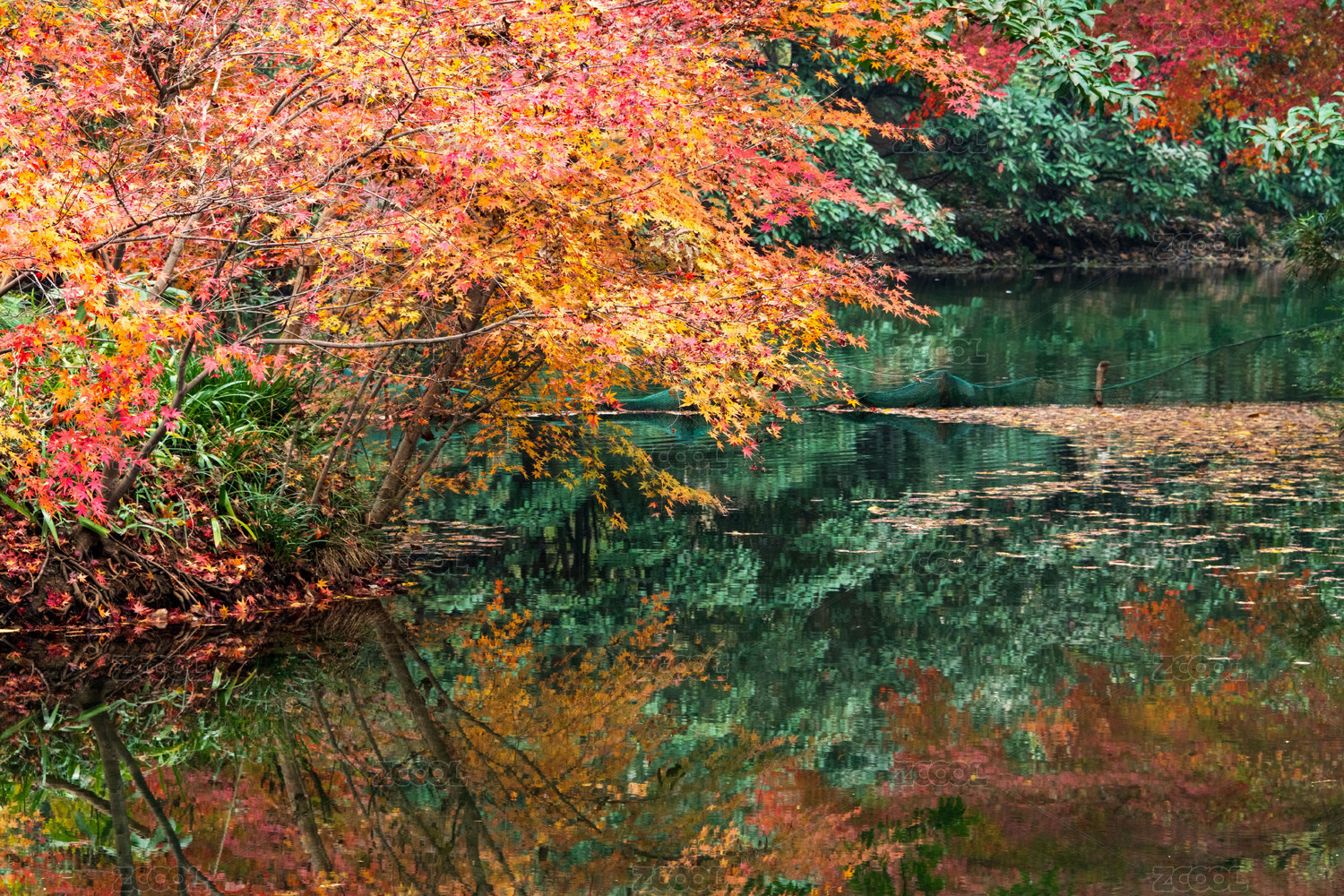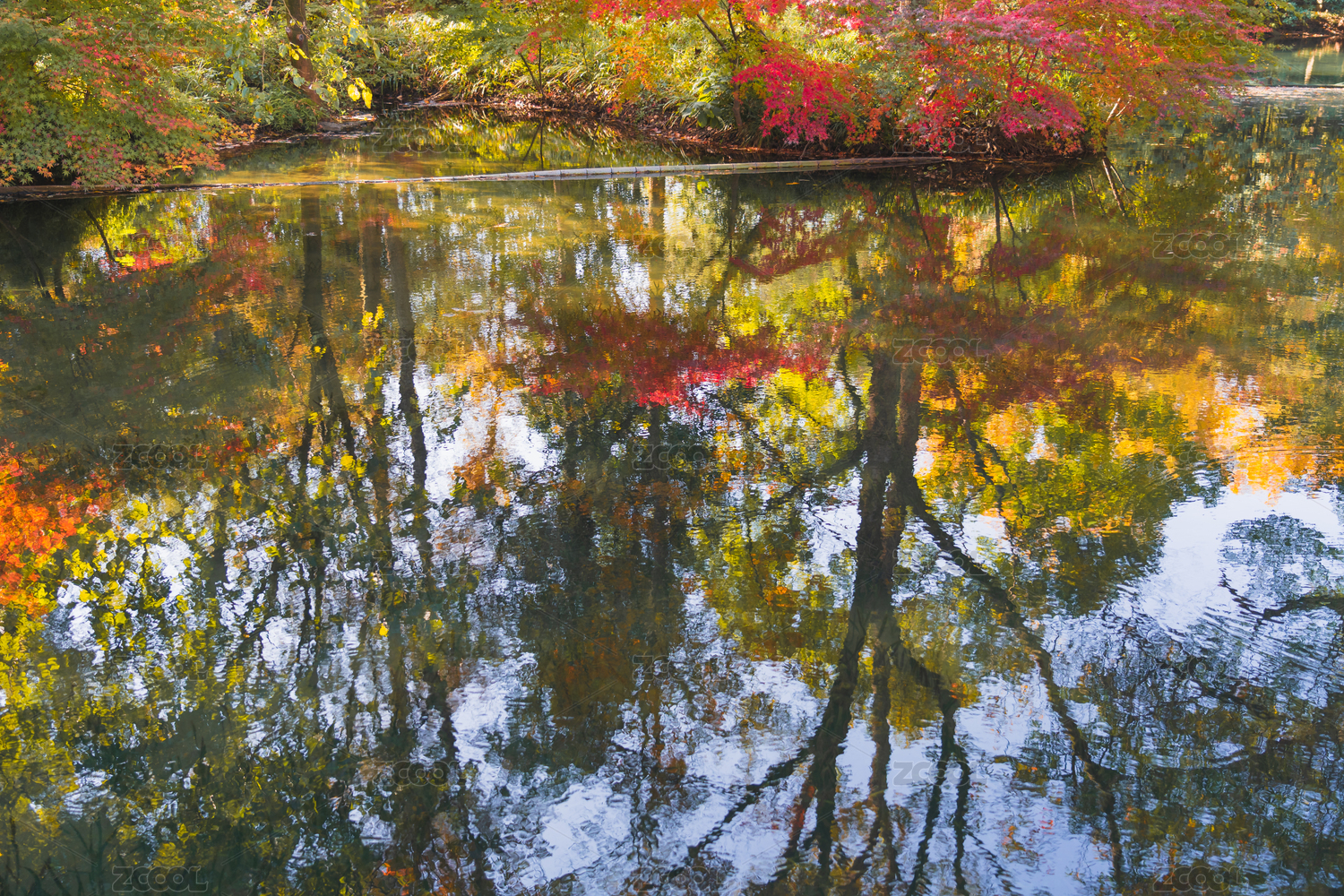 秋天色彩斑斓的树叶倒影在水中