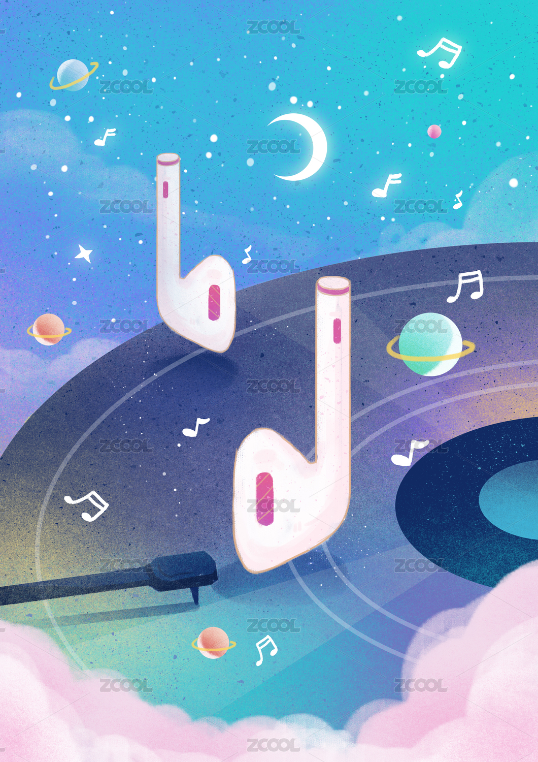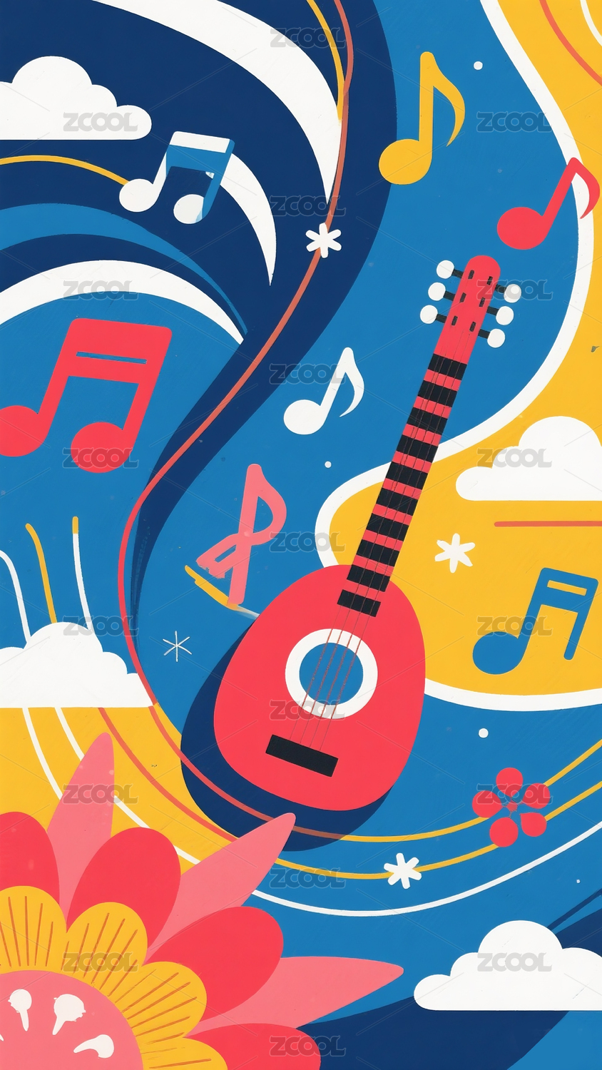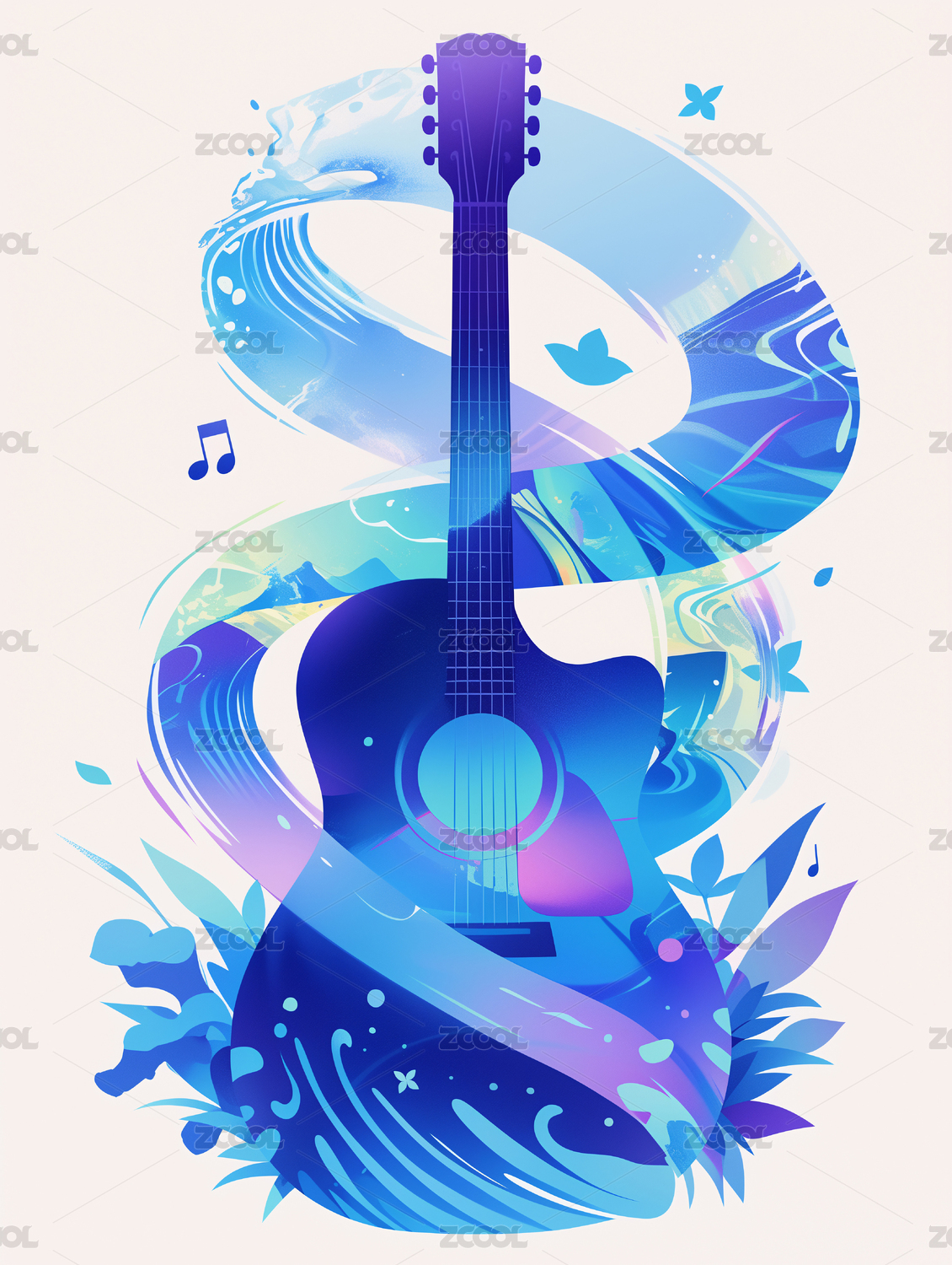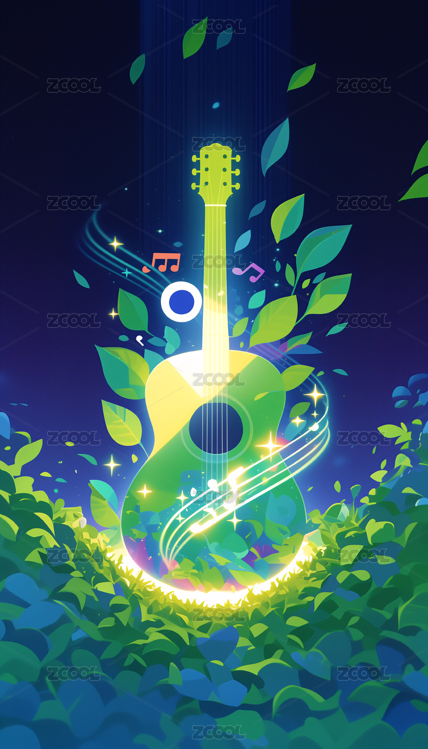 吉他绿色草地叶子灯光音符夏夜音乐节插画