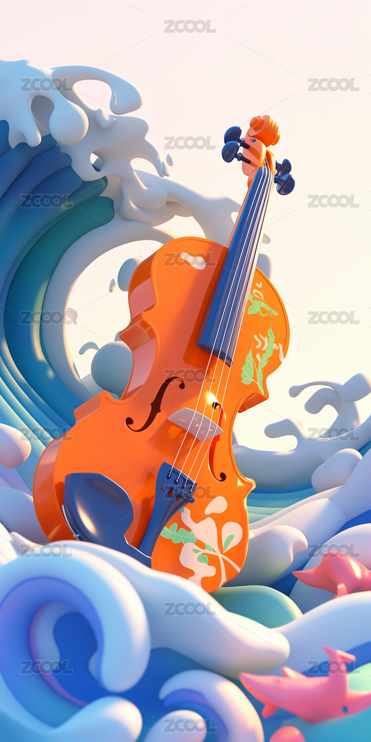 白天晴朗海面起伏波浪中小提琴3D卡通插画