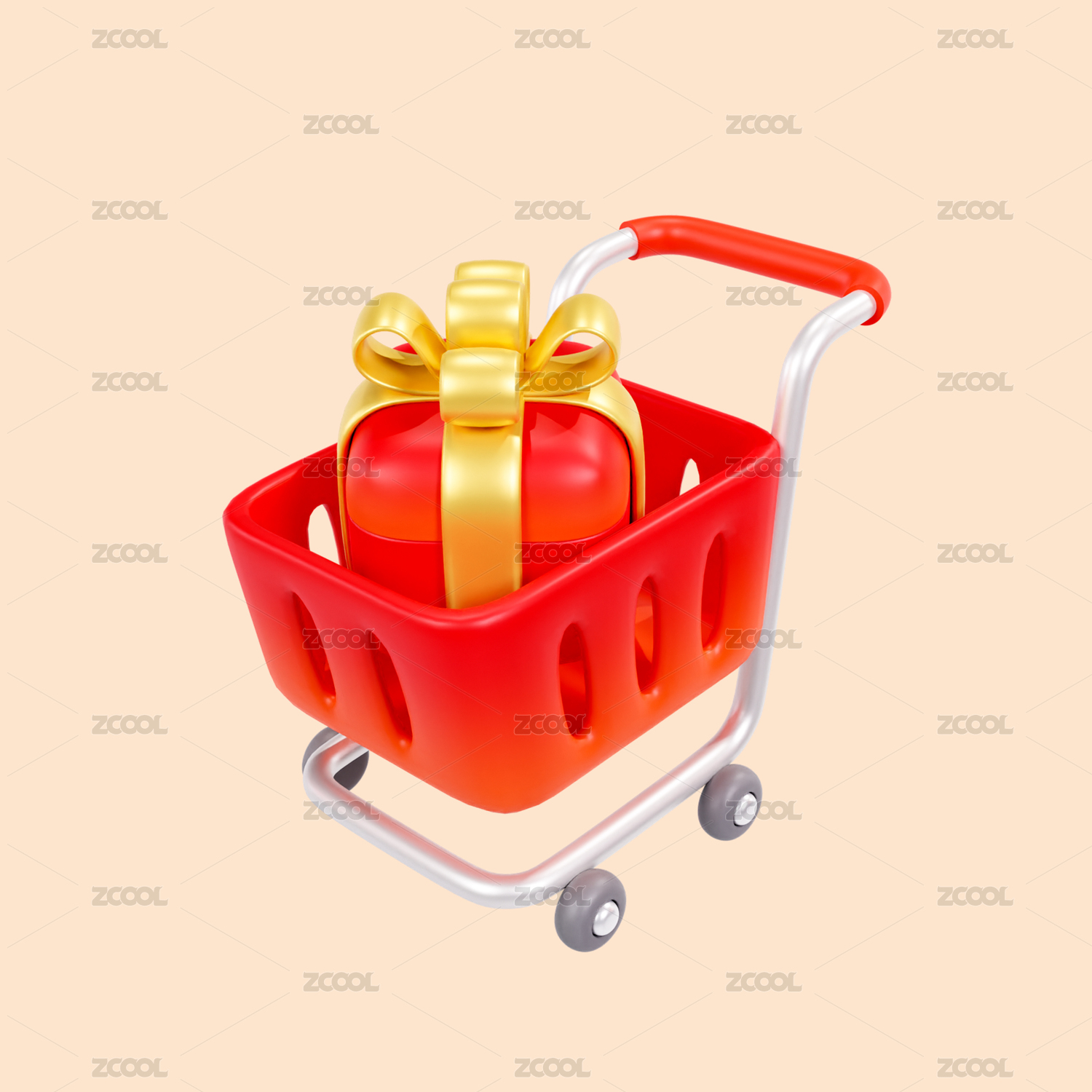 3D红色购物车中放放满了礼盒红包和金币