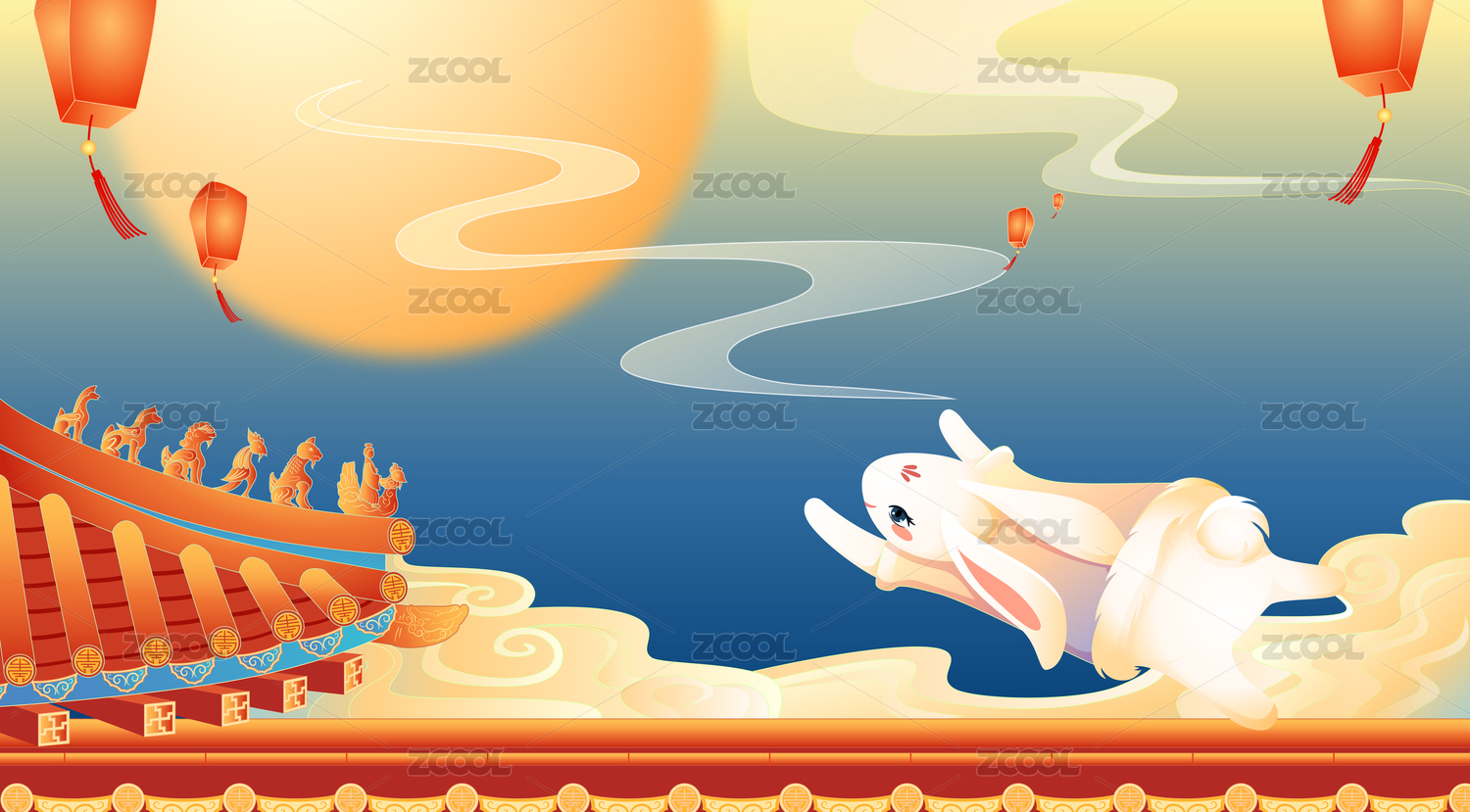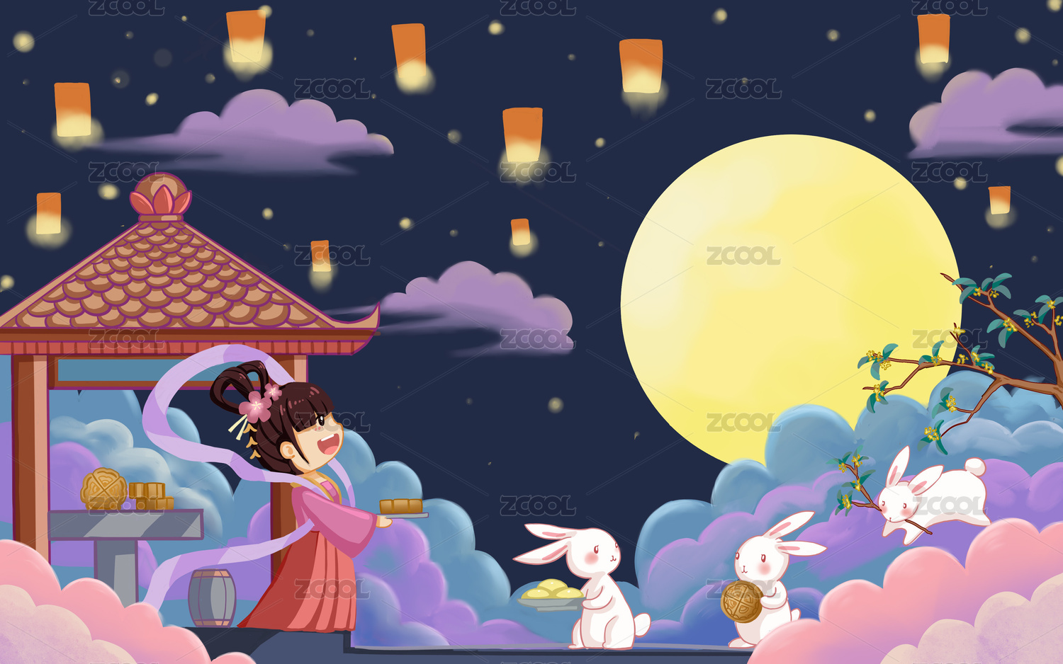 中秋节海报插画几只兔子玉兔在月下玩耍庆祝