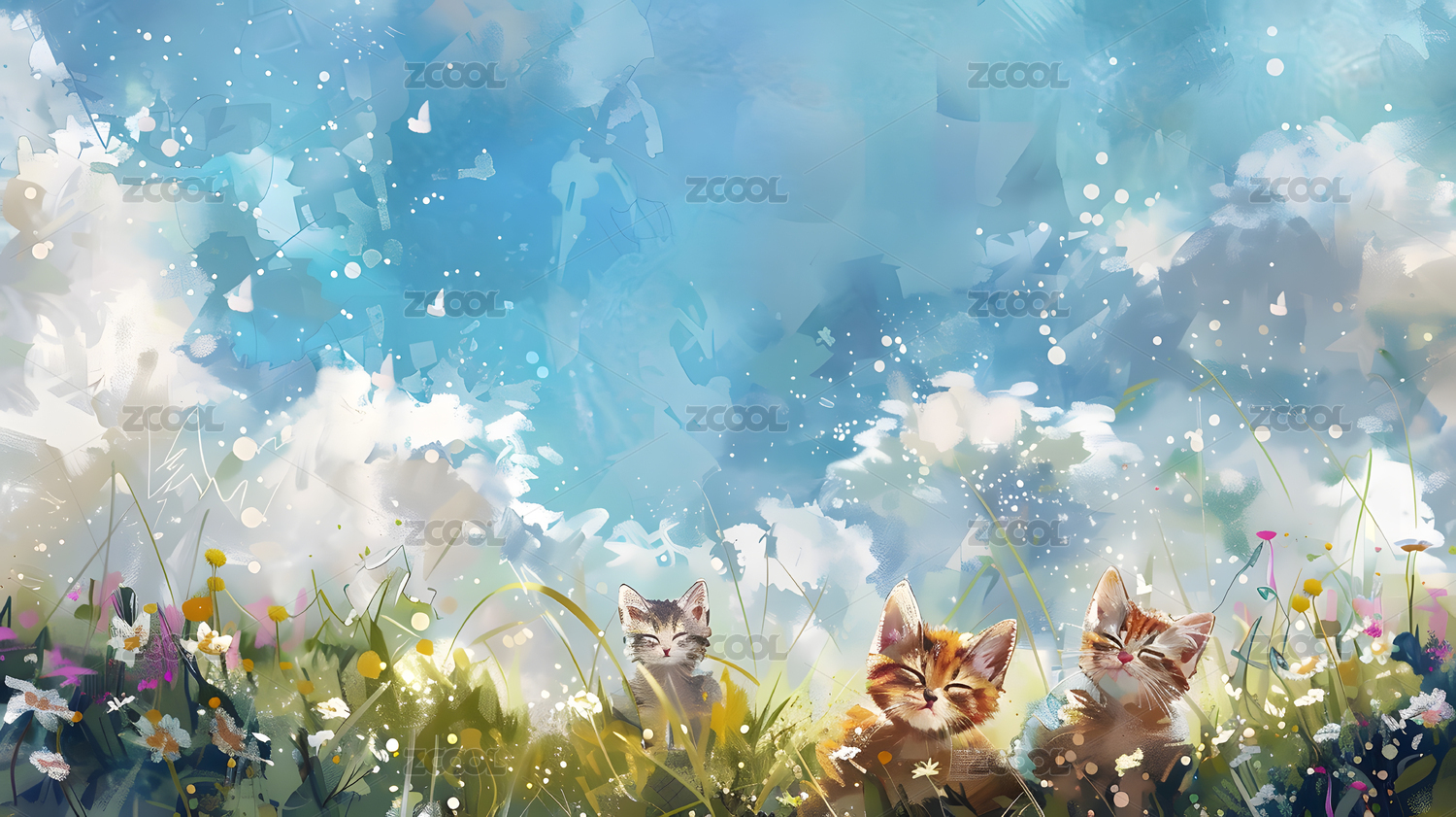 蓝天草地小猫咪绘画作品