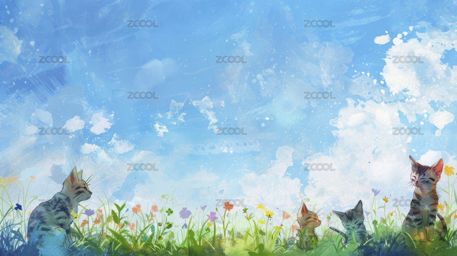 猫咪草地嬉戏水彩清新
