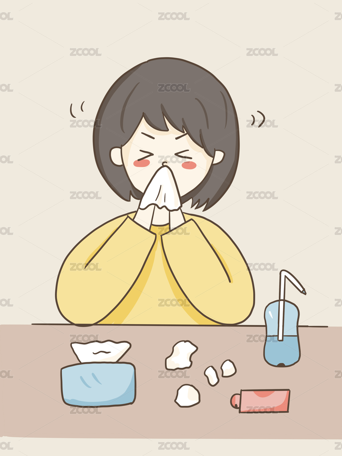 可爱的女孩生病感冒在努力擤鼻涕插画