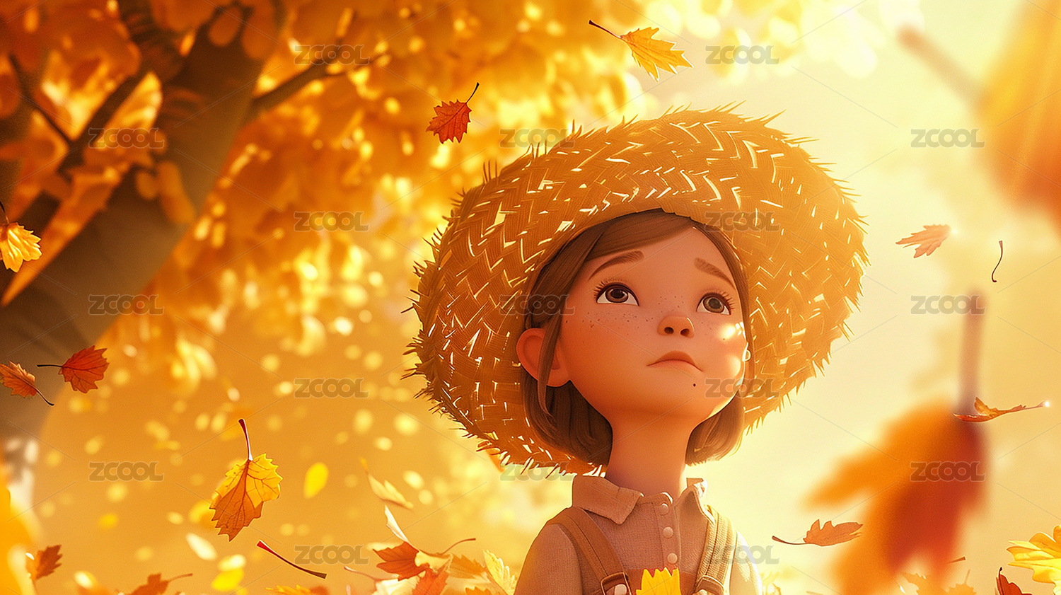 插画,可爱,温暖,田园,卡通,女孩,秋天,落叶,阳光,场景