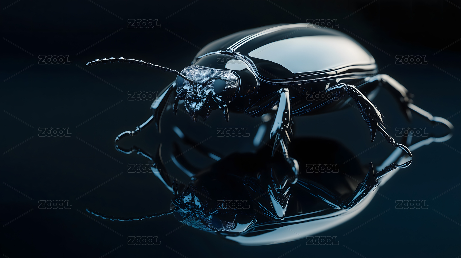 一只镀铬甲虫静置于黑色空间中