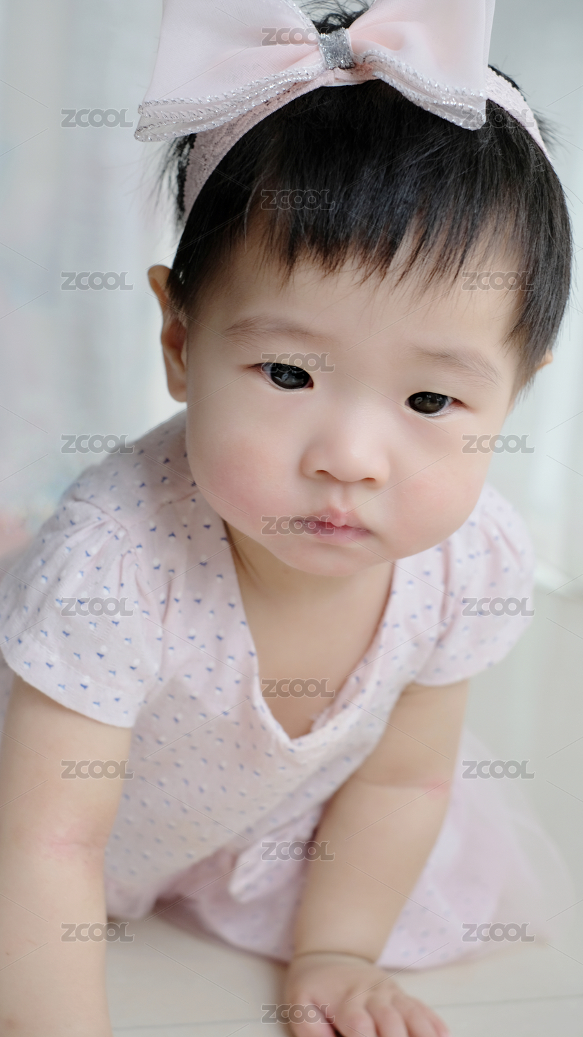 粉色裙子和头花的女宝宝在窗台开心玩耍