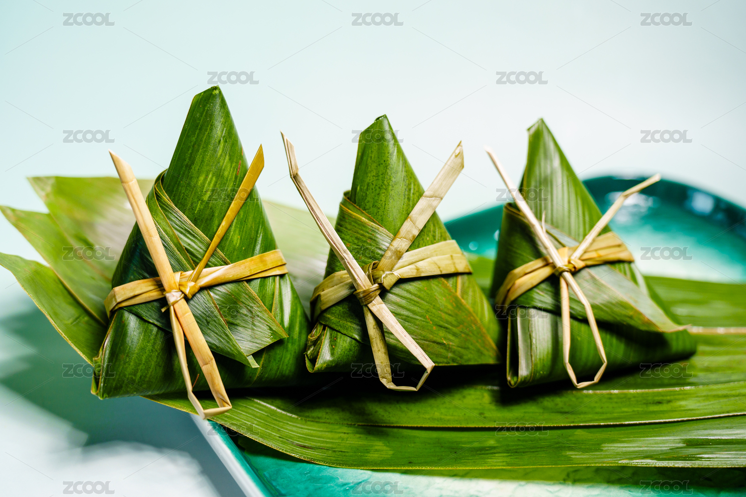 粽叶上包好的新鲜粽子/中国端午节传统节日美食