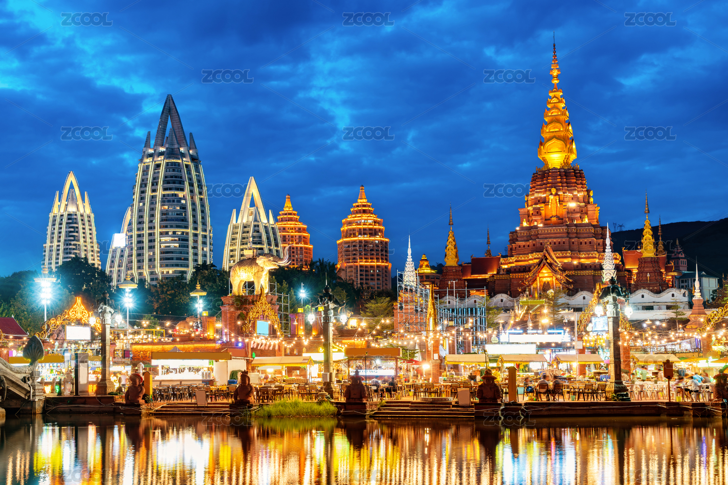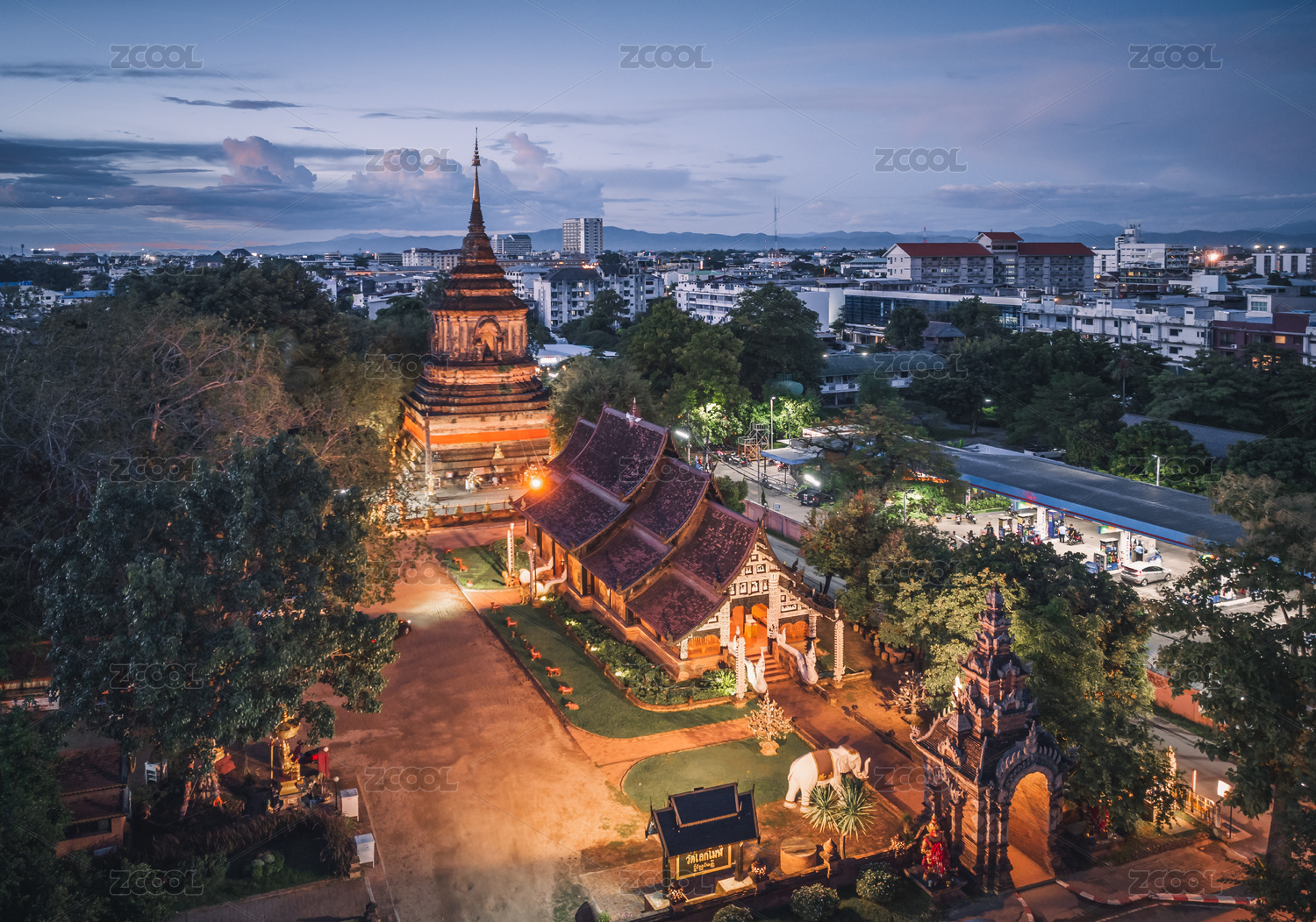 泰国清迈古城罗摩利寺古建筑夜景风光航拍