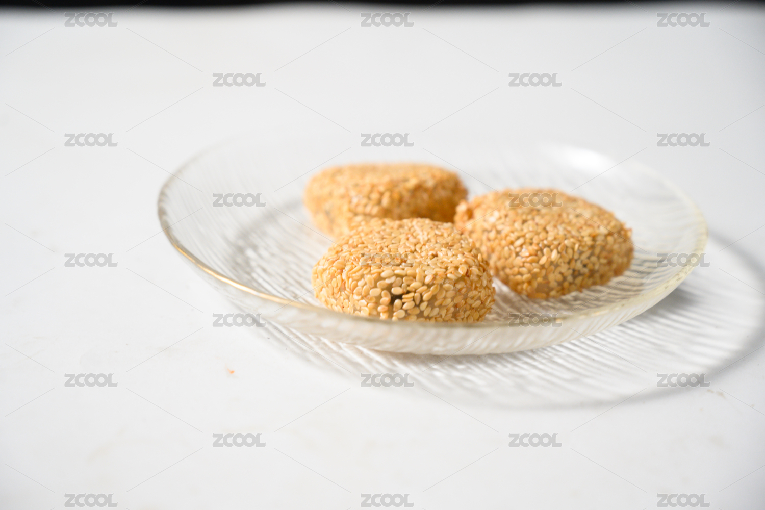 桌面上的白色陶瓷盘子里的美味可口的芝麻饼
