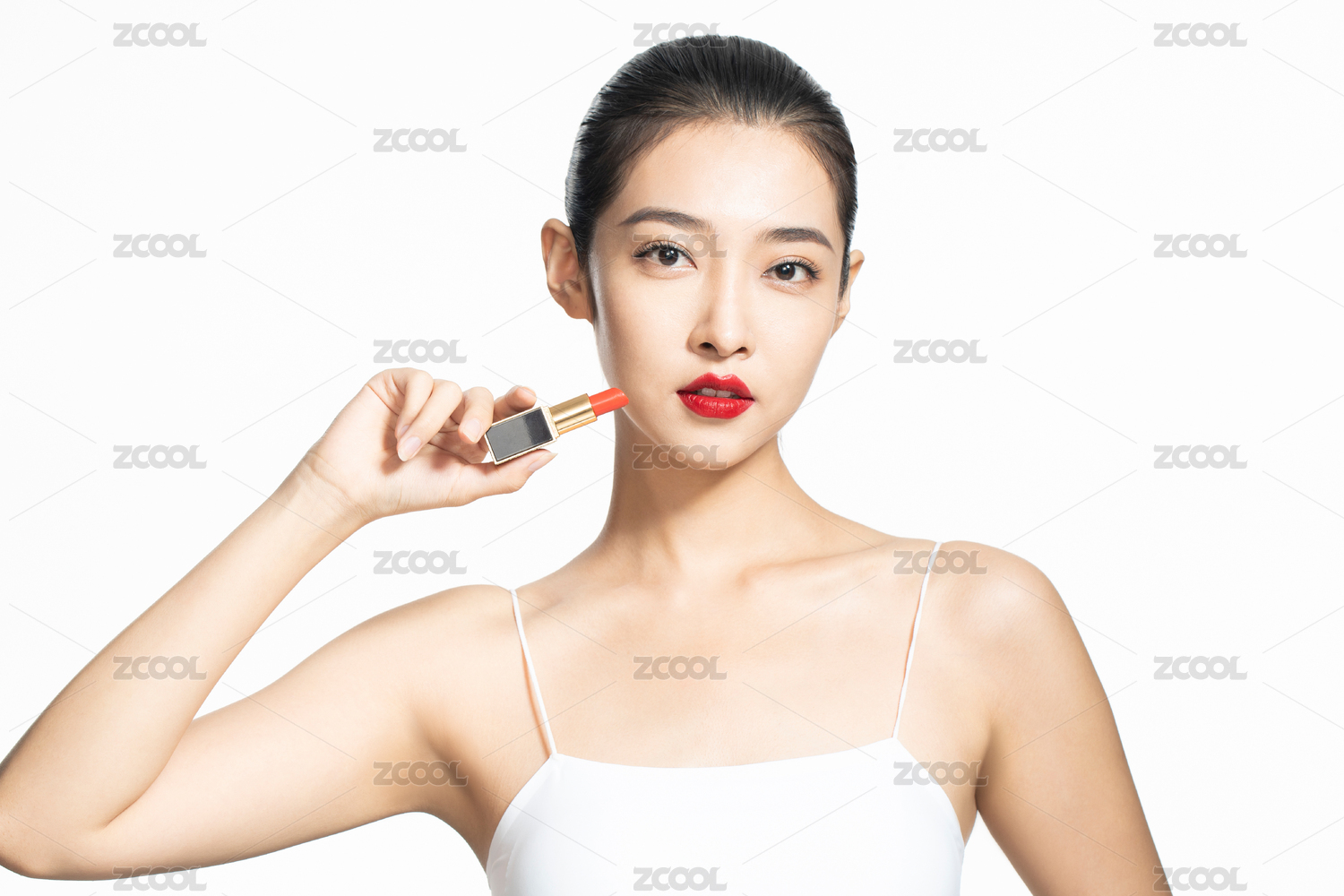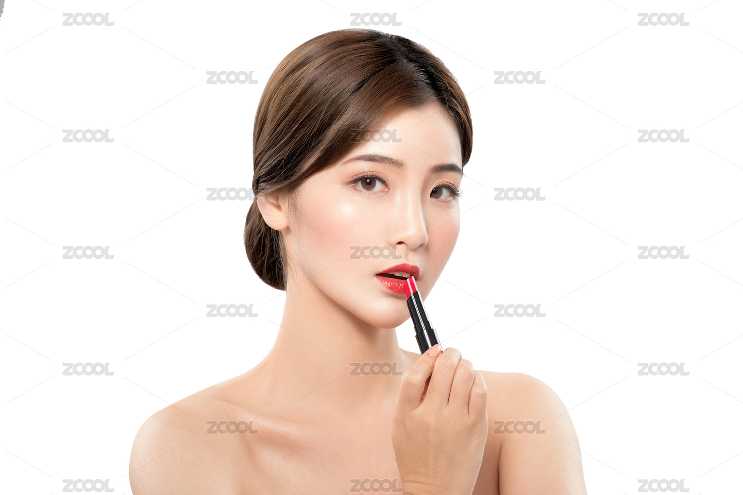 灰色背景里正在涂口红的亚洲美女面部特写,化妆护肤整容