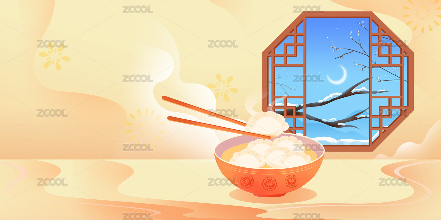 国潮风元宵佳节汤圆梅花湖水山峰等插画