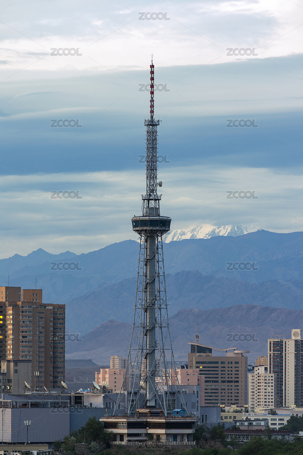 中国新疆自治区乌鲁木齐市电视塔与天山山脉