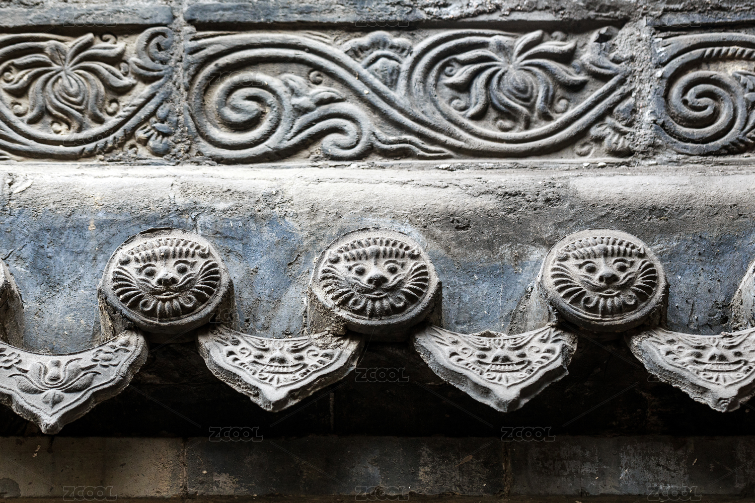 建筑,古代,灰瓦,瓦片,瓦当,雕刻,图案,纹样,兽头,屋脊