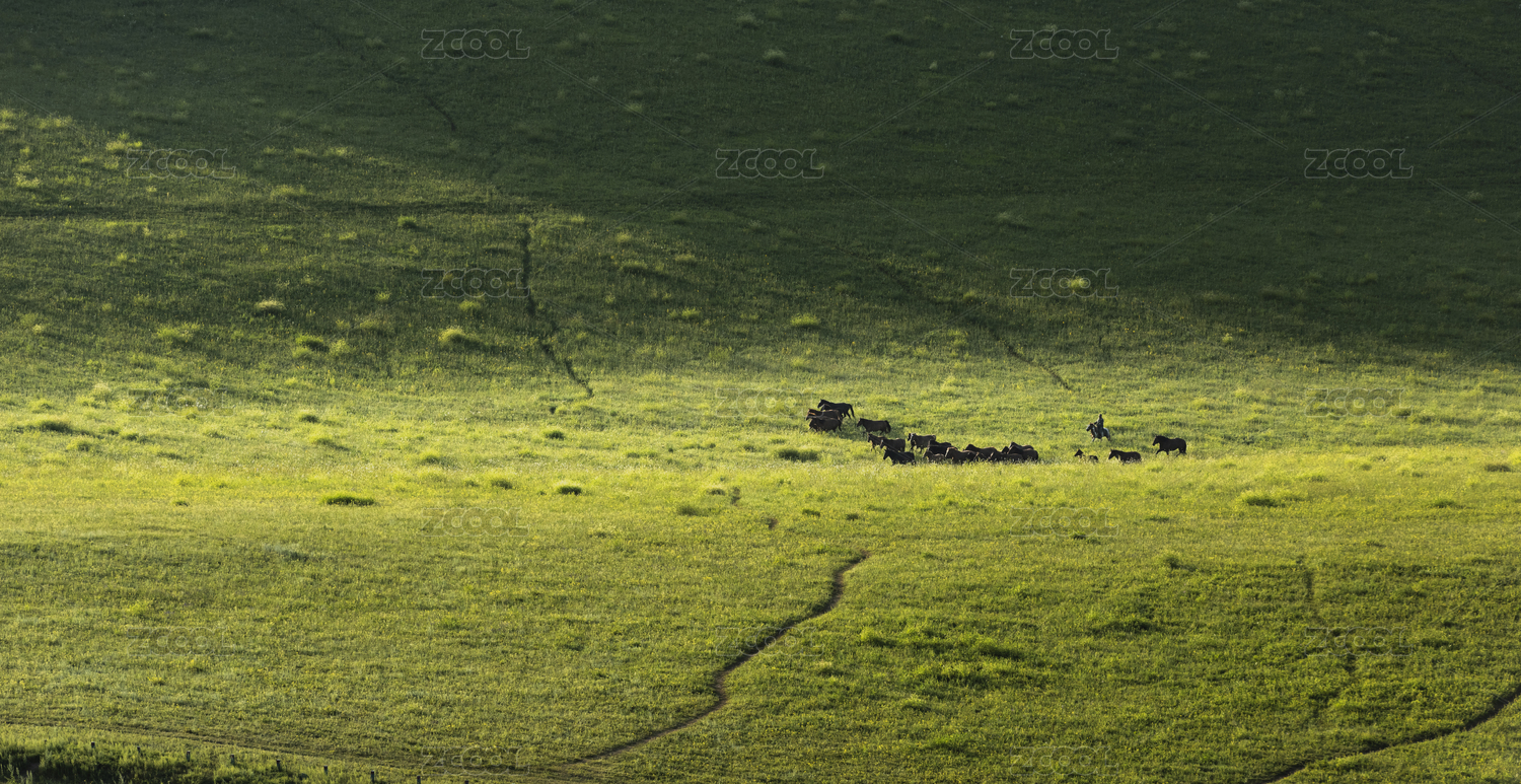 清晨牧民赶着马群策马奔腾在乌兰布统草原上