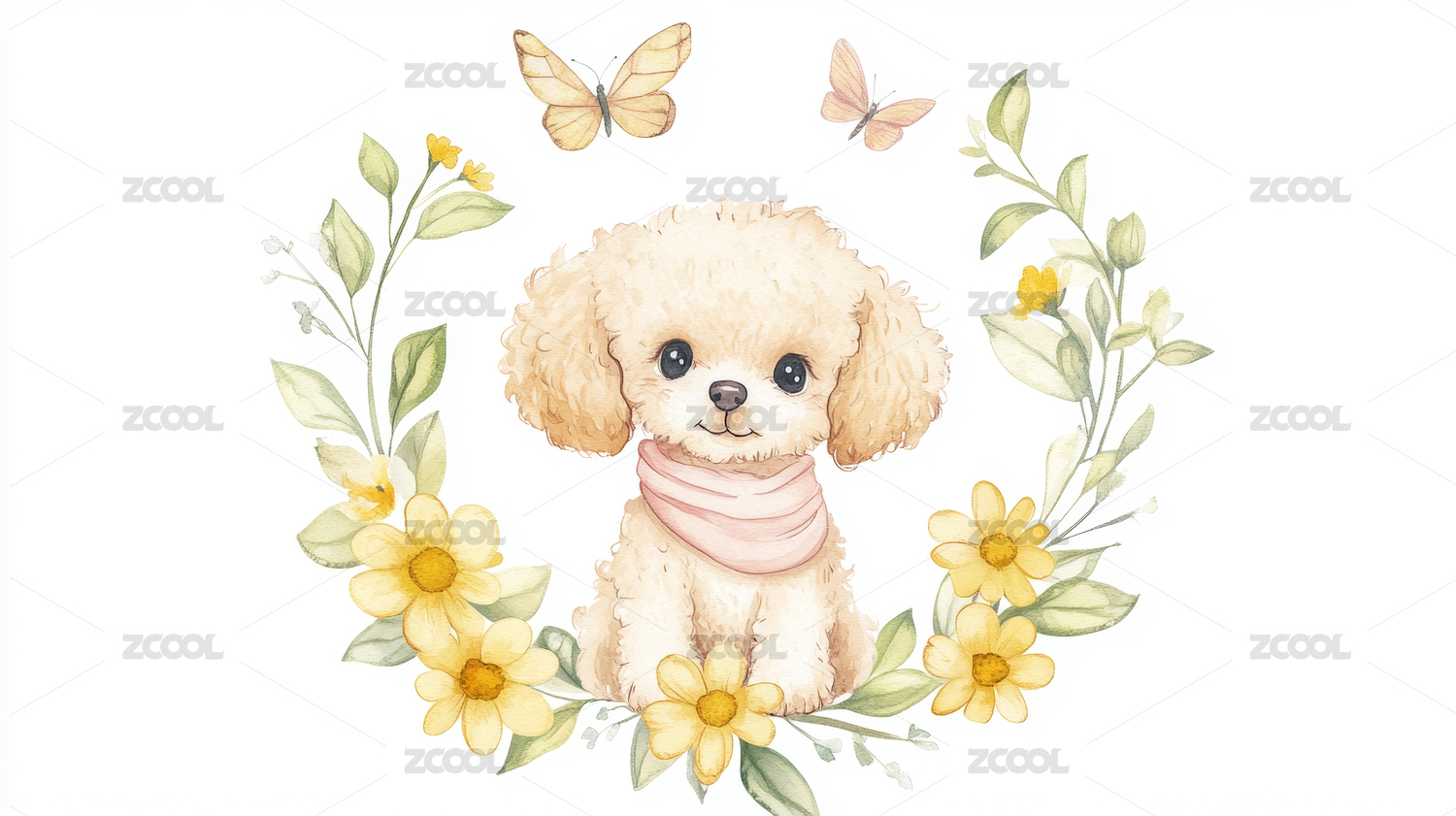 白色背景,插画,小狗,动物,宠物,蝴蝶,玩耍,春天,夏季,自然